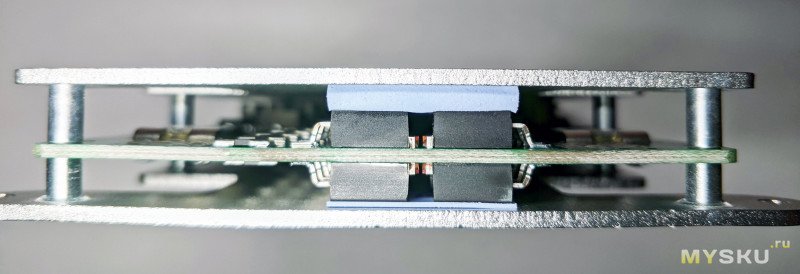 Плата закрывается массивными металлическими пластинами для отвода тепла и защиты самой платы от механических повреждений. На одном из винтов — стоит пломба, вскрытие которой аннулирует гарантию. Учитывая, что у меня заказ из Китая и гарантии всё равно нет, конечно я раскрутил корпус, чтобы посмотреть внутренний мир: