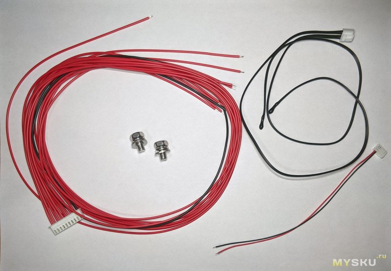 В комплекте, помимо самой BMS, есть провода для подключения аккумуляторов (длина — 68см), двойной термодатчик, два винта для фиксации кабеля от батареи, а так же провод для кнопки активации платы (она опциональная, так как подачей заряда плата тоже активируется).