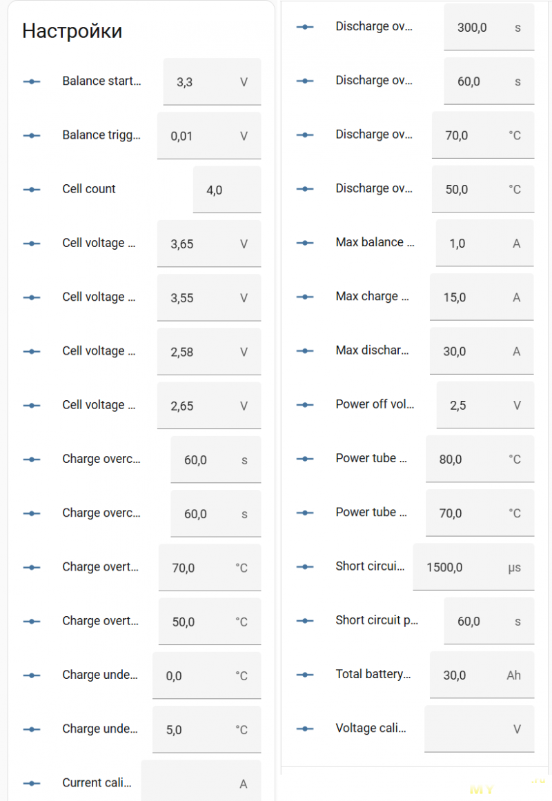 Перейдя в настройки, нужно выбрать тип батареи, количество ячеек, при необходимости откалибровать напряжение, ёмкость, как я писал ранее, указывать не обязательно, она сформируется после цикла. Так же очень много настроек по самой батарее, которые вы подбираете индивидуально, в зависимости от технических спецификаций ваших аккумуляторов. Можно указать максимальный ток заряда, разряда, максимальное напряжение, минимальное напряжение, ток начала балансировки, шаг дисбаланса между ячейками для начала балансировки (от 0.003v), допустимая температура разряда, заряда. В общем полная свобода настройки, в отличии от дешёвых (не смарт) BMS, где все эти параметры статичные и установлены в процессе изготовления. Так же можно устанавливать время, после которого BMS уйдёт в сон и перестанет потреблять энергию до повторной «активации» платы (подачей зарядки или кнопкой).
