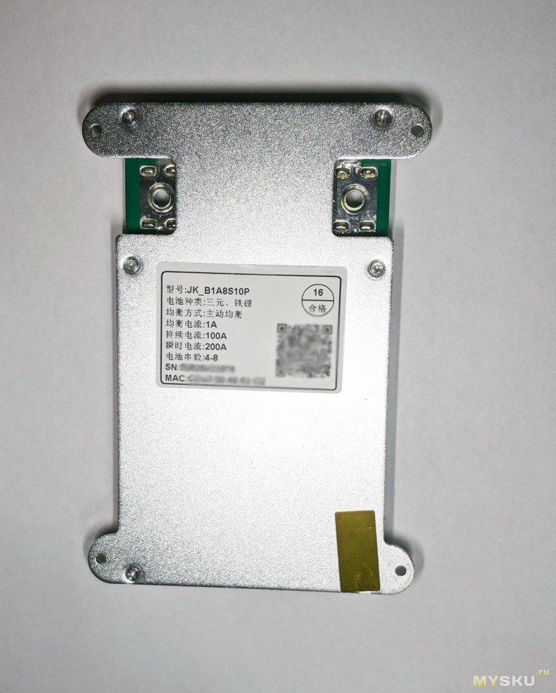 На обратной стороне устройства — наклейка с названием модели и характеристиками BMS, а так же MAC-адрес BLE, который нам ещё пригодиться.