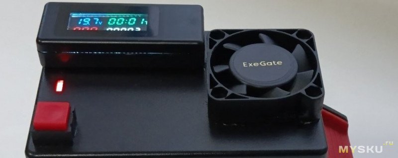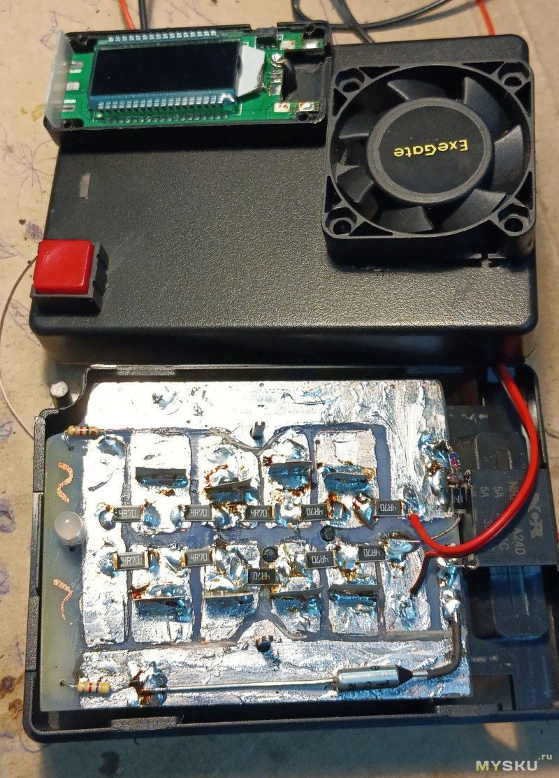 Соответственно, рядом с вентилятором можно (!!! нужно!!!) разместить сам тестер, благо он по ширине корпуса отлично подходит. Кнопу — по желанию. Под вентилятор платку с нагрузочными резисторами, если крупные СМД, то паять их лучше не лежа, а на боку — вентилятор лучше будет обдувать. Я бы еще терморегулятор оборотов на вент приделал, простенький, типа составной транзистор и пара резисторов в делителе с терморезистором.