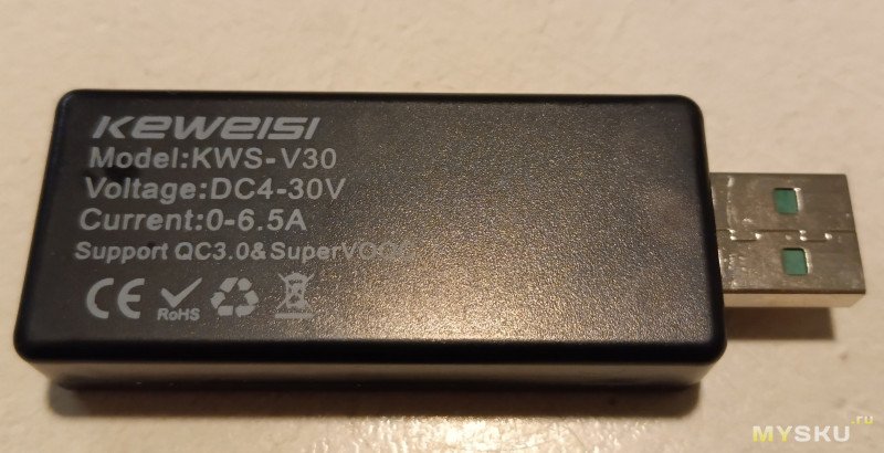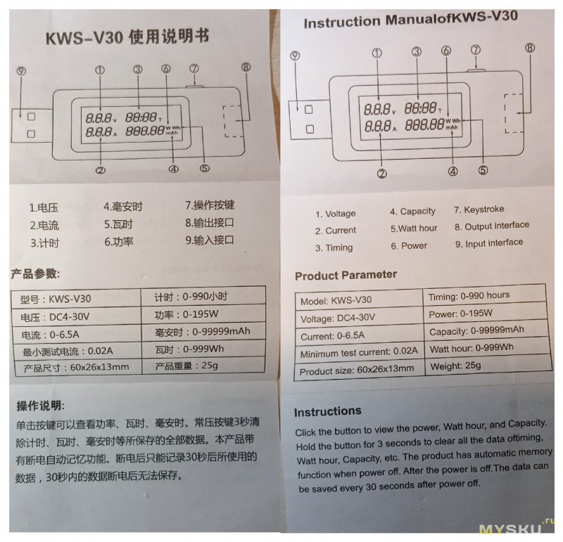 Здесь измеряется заливаемая ёмкость. Я планирую проверять и совсем убитые аккумуляторы, а там можно много интересного намерить. Как известно в дырявое ведро, можно много воды налить.Пару слов о измерителе. На странице товара и в описании нет упоминания Keweisi KWS -V30, есть только фото обратной стороны. Но пришел именно KWS -V30, во всяком случае на нем написано. Комплектация.