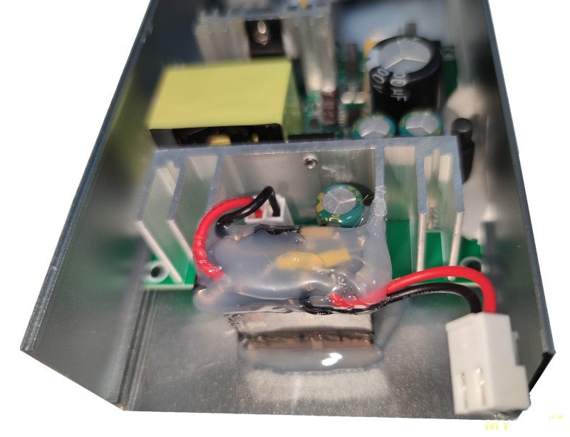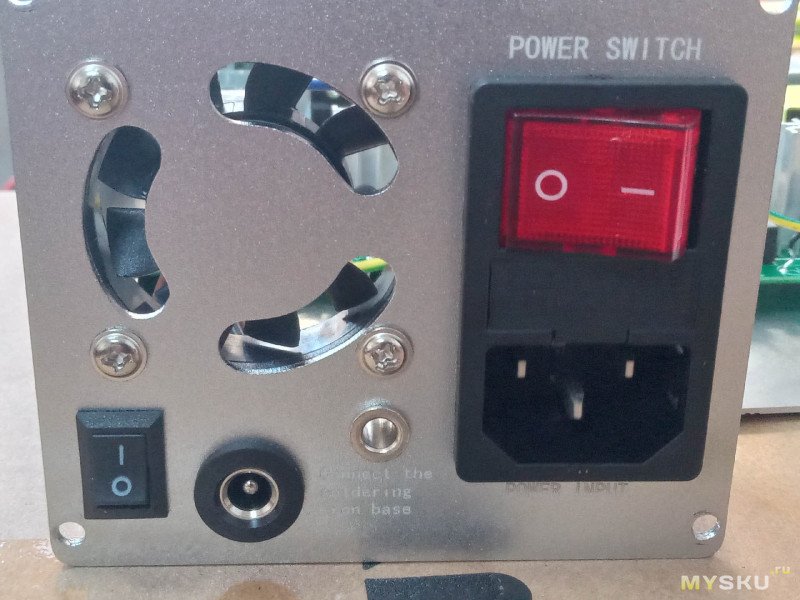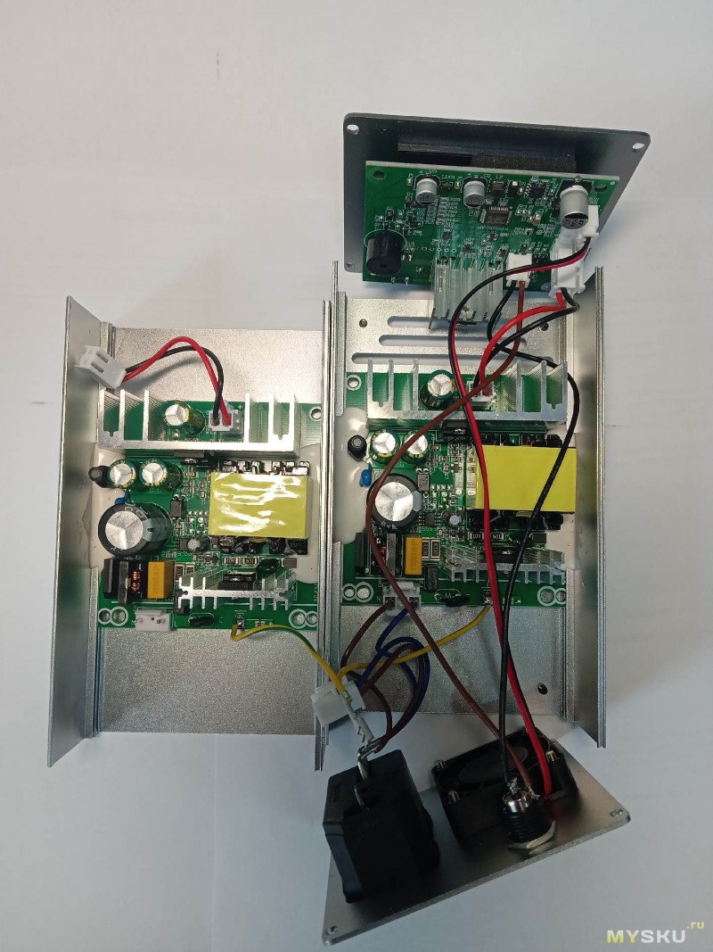 Внутри два блока питания на 24В, судя по внешнему виду каждый на 180-200Вт, на плате управления разъемы от БП соединены последовательно, то есть снимается 48В. Схема кстати аналогична станции Geeboon HC24, говорят у них это и слизали.