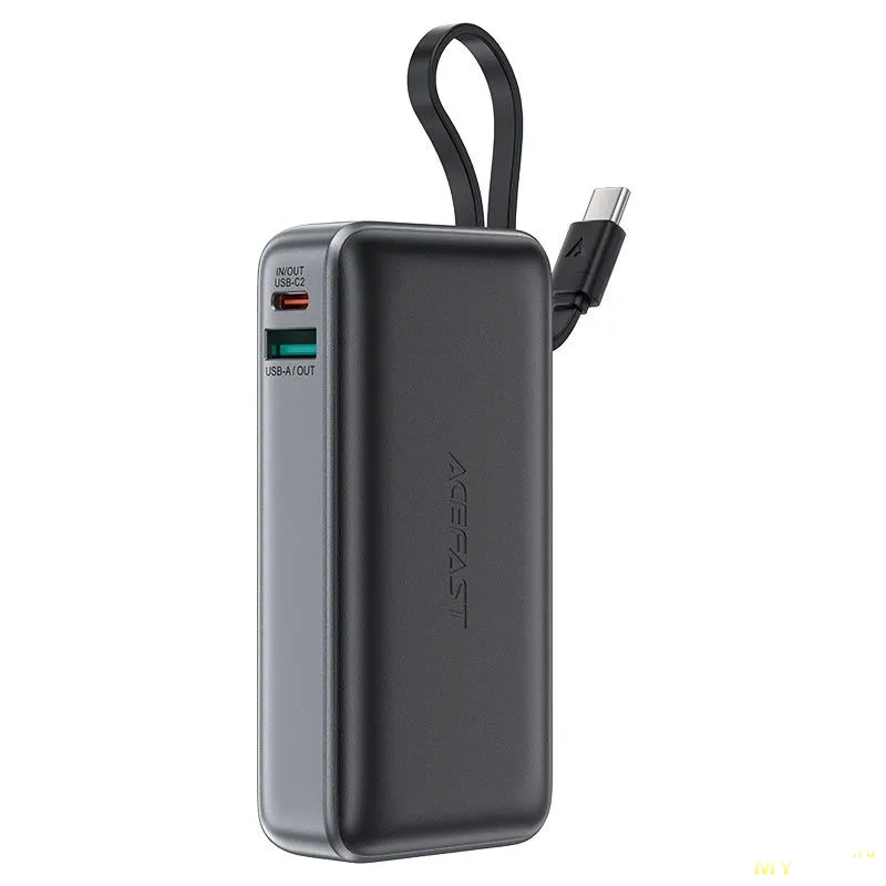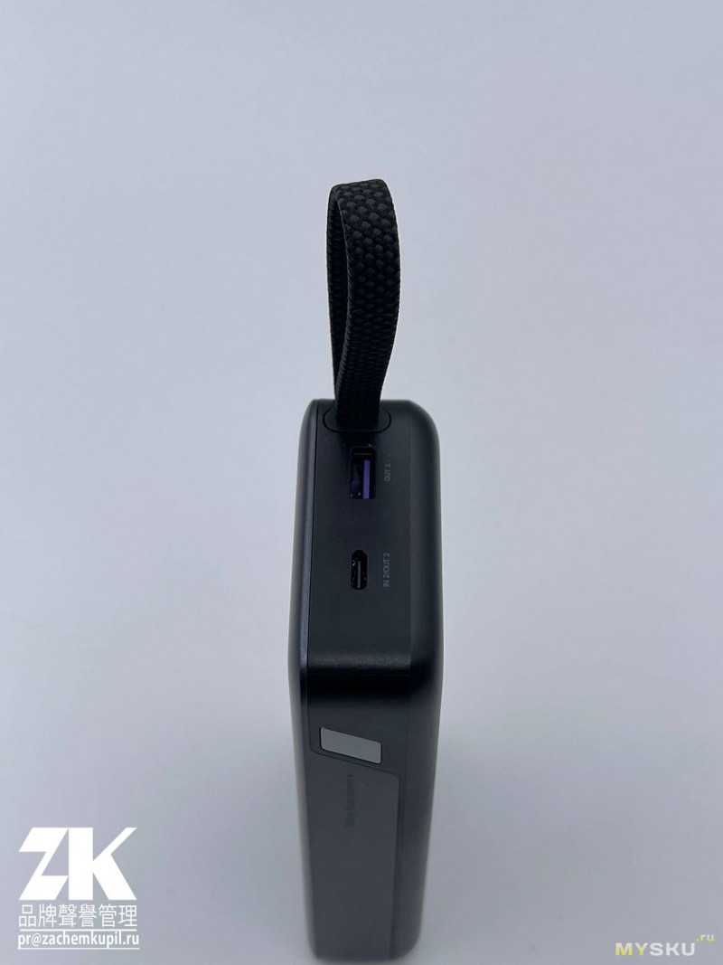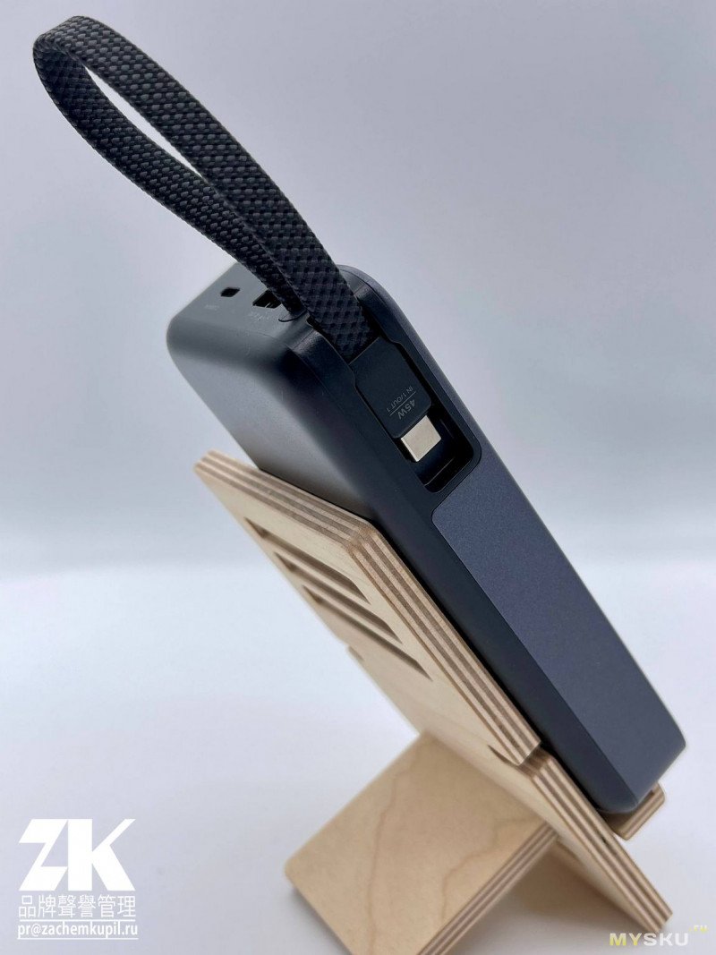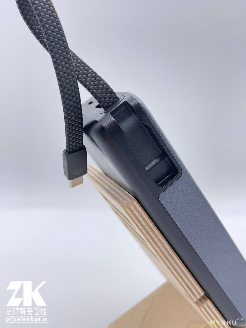 Отдельно внимание следует заострить на главной фишке этого аккумулятора, которая выделает его среди десятков подобных: это встроенный кабель. Причем, кабель является одновременно и петлей для переноски устройства. Он выполнен из плотной оплетки, которая делает кабель тяжело гнущимся, что накладывает определенные ограничения на использования как самого кабеля, так и находящегося рядом порта USB Type-A (многие устройства просто не подключатся полностью и не войдут в порт, так как им будет мешать основание фиксирующей площадки встроенного кабеля USB Type-C). Получается, дизайн ради удобства? В ущерб функционалу? Отчасти да. Кабель фиксируется в пазе и крепится посредством магнитов: таким образом кабель плотно закрепляется с пауэрбанком и образует единое целое.