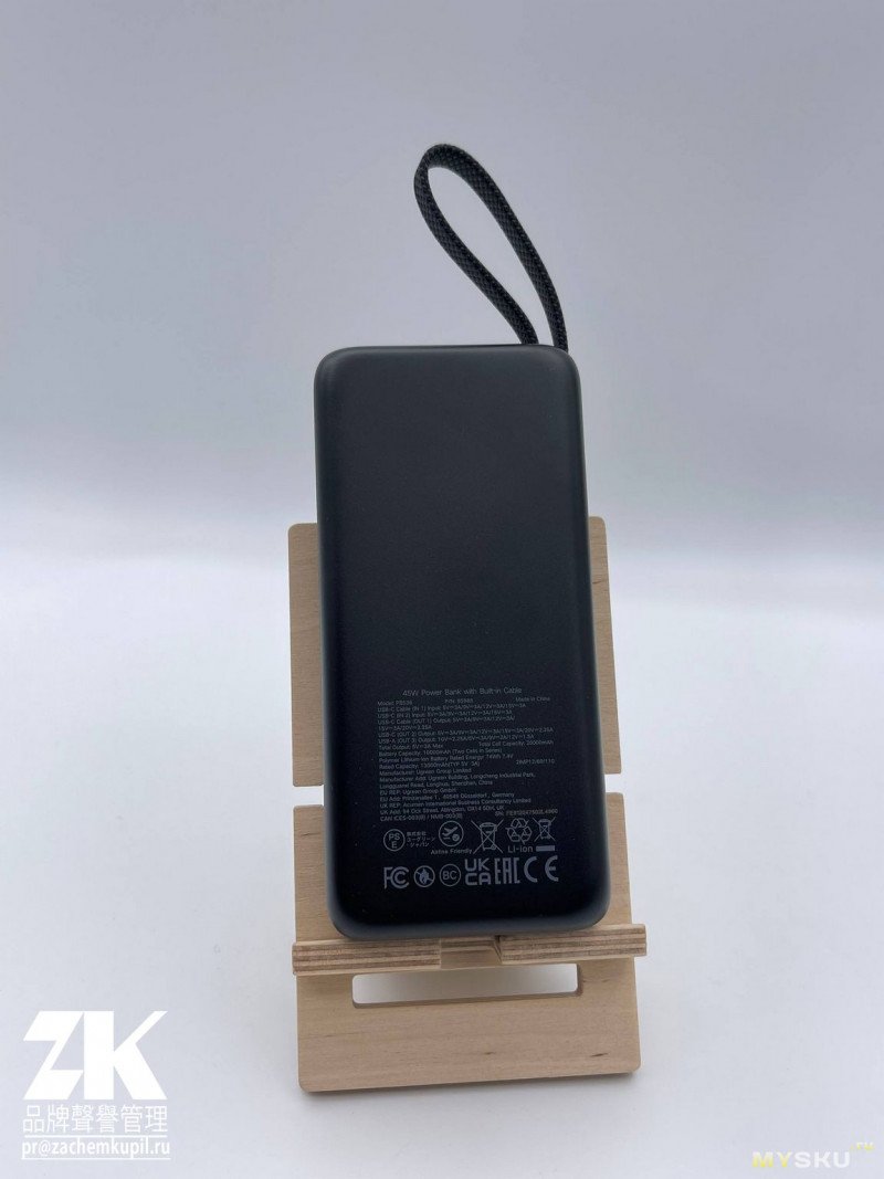 Устройство представляет собой гладкий и аккуратный кирпичик, покрашенный под аллюминий. Однако, сомнений нет, что это пластик: об этом говорит и вес и недостаточная монументальность конструкции, пластик слегка прожимается пальцами и похрустывает. В фронтальной части, рядом с кабелем спрятан также индикатор статуса пауэрбанка. Находится он под крышкой, совсем как фронтальная камера под дисплеем и фактически его невозможно поймать на камеру, однако, он там есть. С тыльной стороны аккумулятор может похвастать матовой черной крышкой с перечислением всех поддерживаемых протоколов зарядки, а также сертификаций.