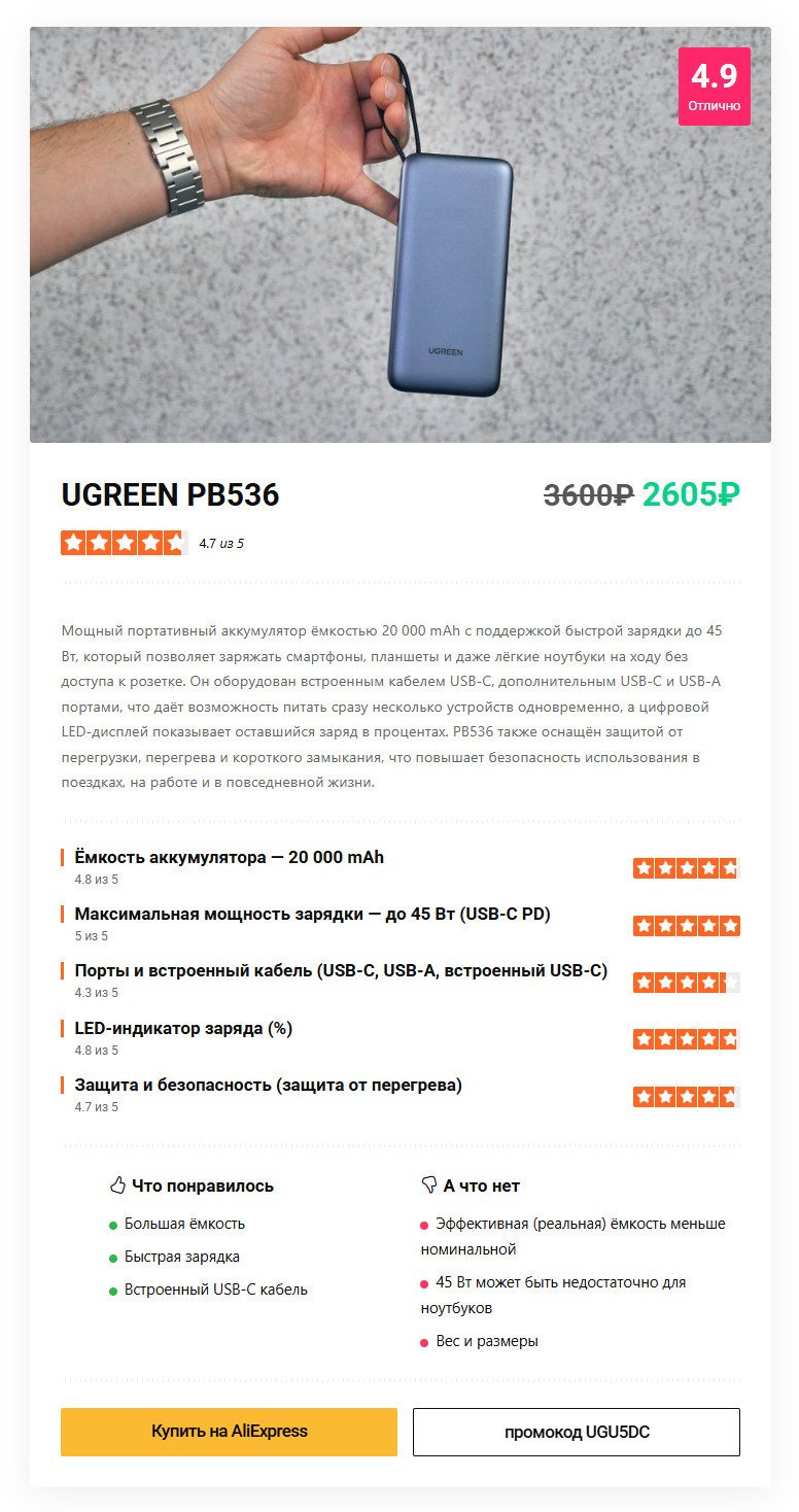 В итоге портативный аккумулятор UGREEN PB536 на 45 Вт и 20000 мАч это продуманный, мощный и удобный портативный аккумулятор без лишнего пафоса. Он делает ставку на скорость, универсальность и практичность, а встроенный кабель и цифровой дисплей превращают его из просто «большого пауэрбанка» в действительно удобный инструмент на каждый день. Это тот случай, когда характеристики на бумаге совпадают с реальным опытом использования, а бренд подтверждает свою репутацию не громкими заявлениями, а стабильной работой каждый день.