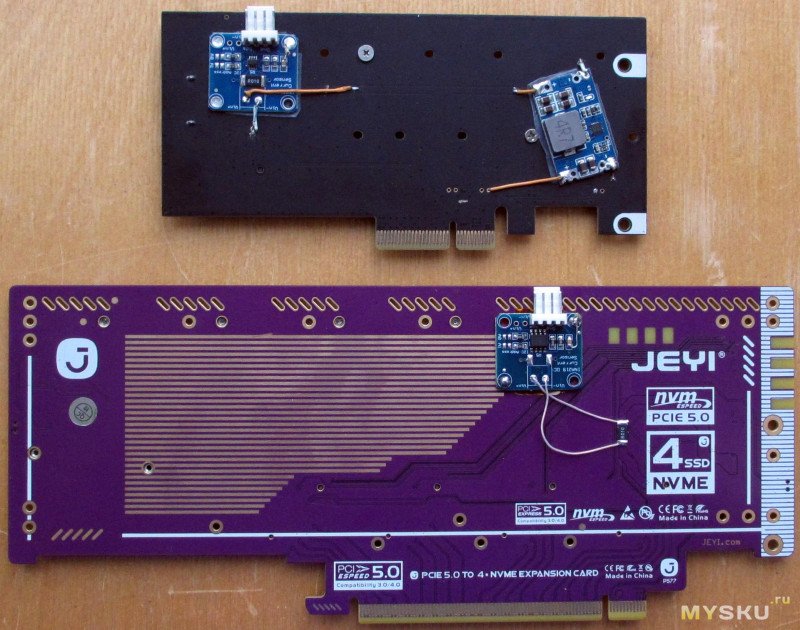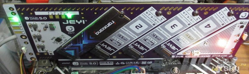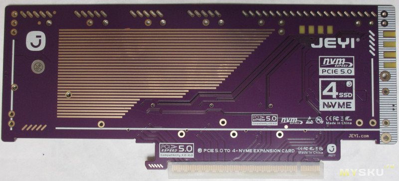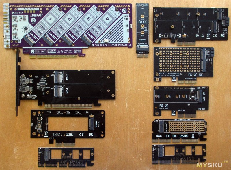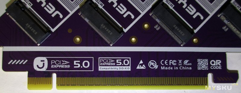 Прикупив fanxiang s910max столкнулся с проблемой — оказалось что несмотря на поддержку со стороны матери pcie 5.0 в x16 слоте, из почти десятка переходников работать в старшем режиме не желают все, кроме одного, а тот — x1. Ознакомление с вопросом показало, что должны работать переходники от asus из комплекта некоторых плат, которые даже на вторичном рынке стоят совершенно негуманно. Поиск на али показал, что появилось несколько переходников от jeyi с явно указанной поддержкой 5.0. Не то что бы мне нужна была именно версия на 4 разьема, но разделять слот для пары устройств стендовая мать умеет, а стоил такой переходник на момент покупки всего в полтора раза дороже одиночного (если кому надо, цены стоит отслеживать, вчера был 1881, а под новый год почти 3т). Он и был заказан в минимальном комплекте без термонаклеек. Версии на 1 ssd: