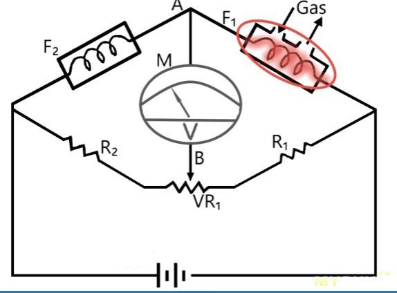 При появлении газа сопротивление активного элемента растет, баланс моста нарушается, и на выходе появляется напряжение (в милливольтах), которое линейно зависит от концентрации газа (в диапазоне до 50–60% НКПР/LEL).