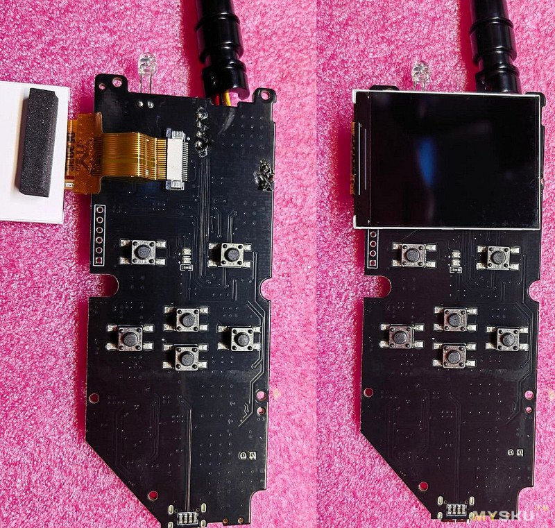 Сигнал рассогласования измерительного моста Уитстона, возникающий вследствие изменения дифференциального сопротивления активного и компенсационного элементов, поступает на схему измерения и преобразования. Данный каскад предварительного усиления и преобразования сигнала выполнен в выносном гибком зонде в непосредственной близости от сенсора, что позволяет минимизировать влияние электромагнитных помех и падения напряжения в проводах до микроконтроллера. (Так как эта часть схемы находится под самим датчиком мне не удалось ее сфотографировать, требуется уже выпаивать датчик, а мне не хочется его повредить перегревом)