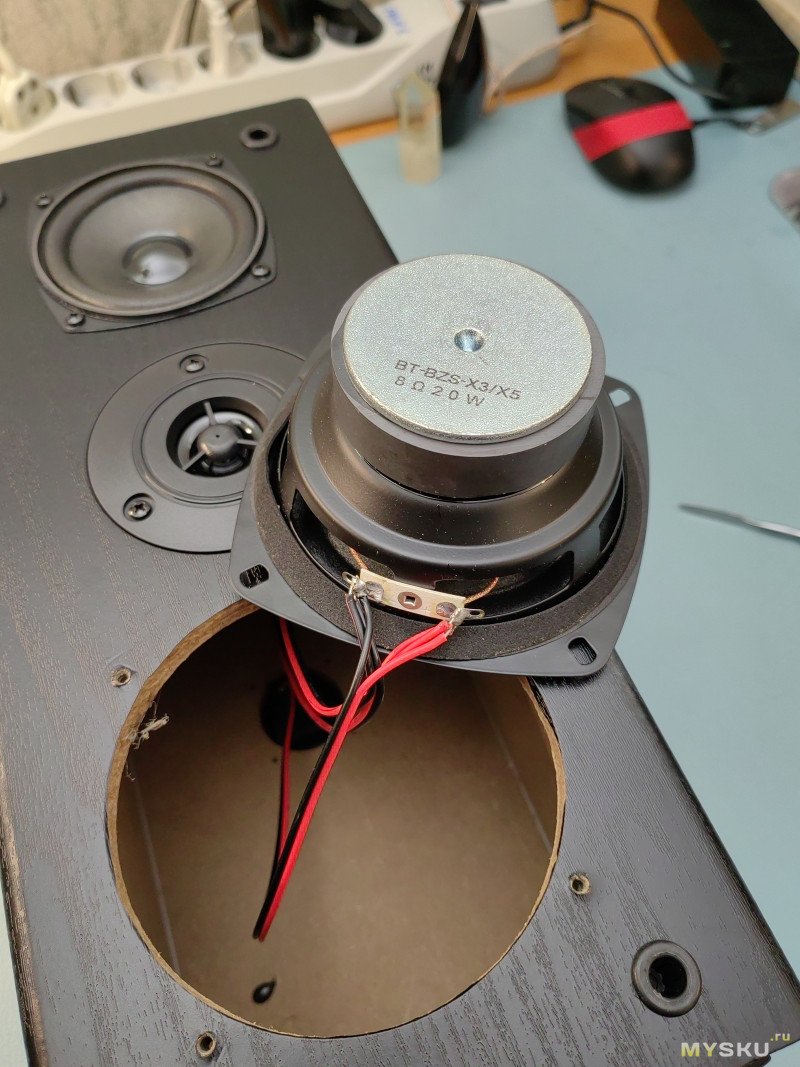 И все с одной и той же надписью BT-BZS-X3/X5 только разные по мощности. НЧ: 20 Вт, СЧ: 15 Вт, ВЧ: 10 Вт. Я бы смело поделил мощность на два. Что в итоге соответствовало бы физическим размерам, а именно колонкам мощностью 7-10 Вт.