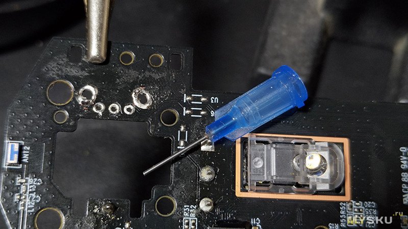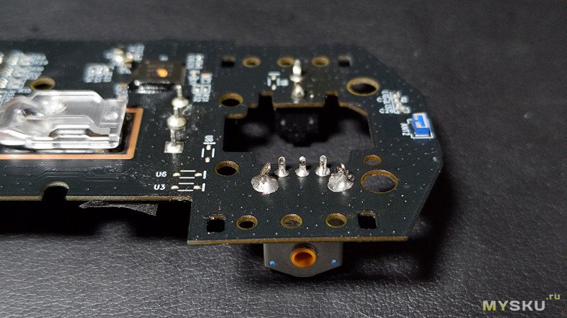 Энкодер, установленный с завода, припаян на тугоплавкий высокотемпературный припой. Чтобы его снять, потребуется сначала просто пропаять все его контакты свинцово-содержащим припоем с добавлением флюса. Затем с помощью медной оплётки и полых игл убрать поочерёдно излишки припоя. Потребуется терпение, ведь это многовыводной элемент. Как альтернатива — разломать корпус штатного энкодера кусачками и по одному контакту спокойно выпаять. Тоже вариант.
