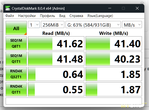 На корпусе красуется надпись USB 2.0 High Speed. Как мы знаем, это 480Mbit/s. Конечно, это неправда, и в реальности получается где-то 20-30 с учетом всех оверхедов перегруженного протокола… Но давайте проверим скорость, подключив флешку USB 3.0 через хаб к порту USB 3.0