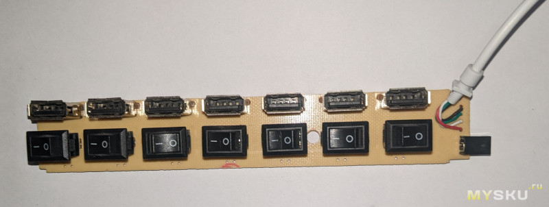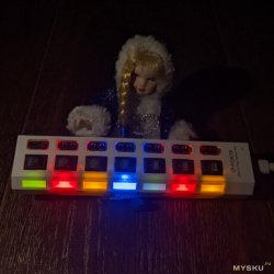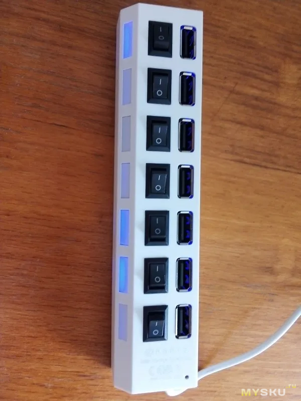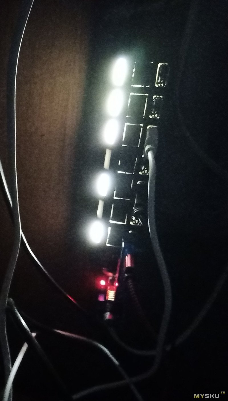 Итак, перед нами хаб на 7 портов. Выключателей тоже 7. Подсветка какая-то слабая и светит непойми откуда.