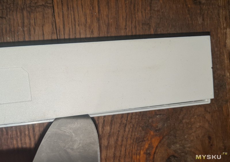 Внутри мы видим желтый текстолит с двумя какими-то чипами, малюпусенькие синие светодиоды (это с противоположной световодам стороны — вот и выяснилось, что не так с индикаторами) и странные серые полоски, наклеенные прямо на плату. Пайка оставляет желать… пайки.