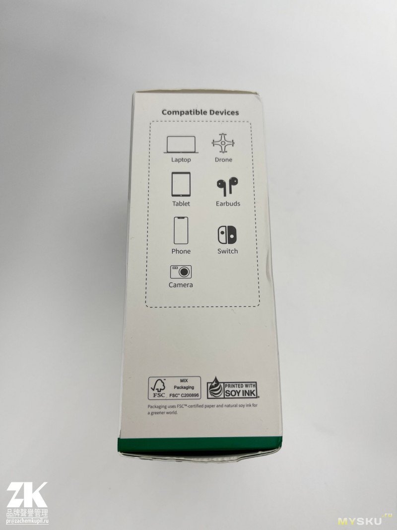 С торцевой стороны указан список устройств с возможностью зарядки, а сама модель указана только снизу коробки. Странно, обычно модель написана или сзади или с фронтальной части. Мелочи!