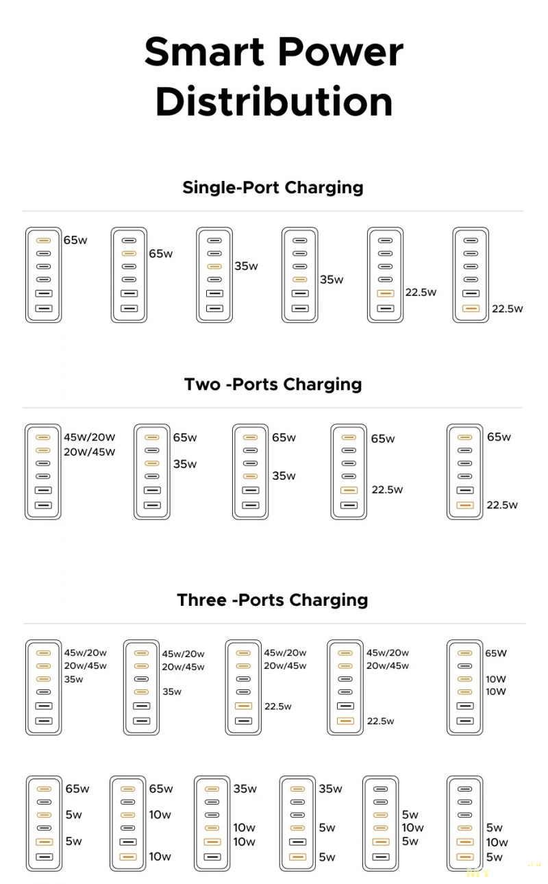 Я баловался с различными портами всеми возможными способами и вынес главное: порт С1 и выдает до 65 Вт, порт С3 имеет ограничение уже 35 Вт, а порт А1 выдает максимум 25 Вт. Важно понимать, при подключении дополнительных устройств, номинальная мощность распределяется равномерно среди всеми подключенными устройствами. Хотите зарядку быстрее? Отключайте от порта С2 устройство и получите максимально доступные 65 Вт на порте С1.Выводы: