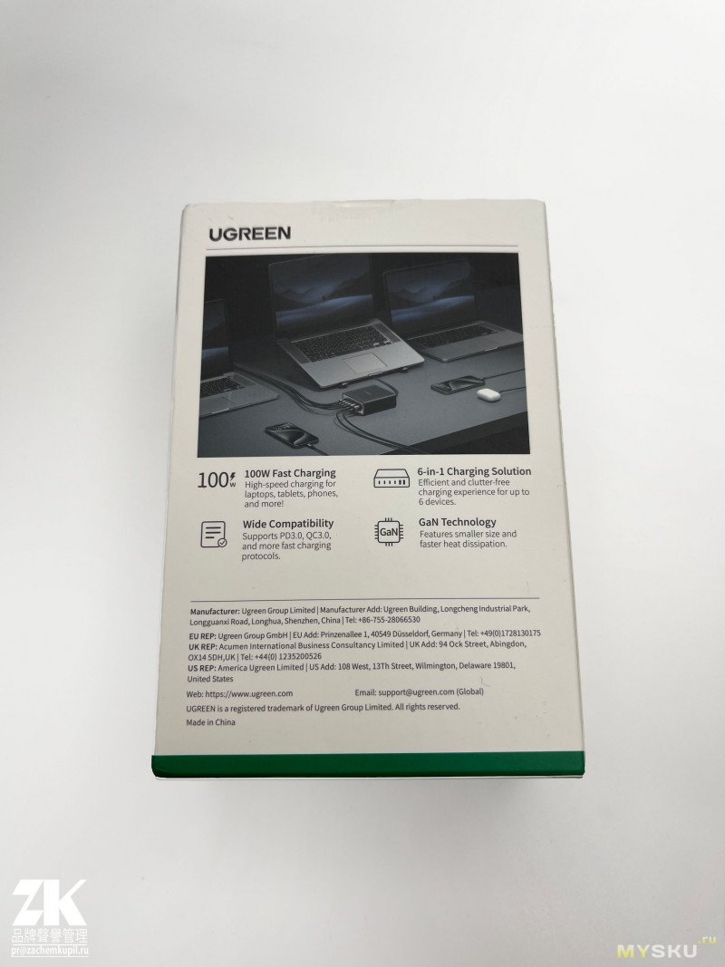 Устройство поставляется в классической фирменной коробке UGREEN — строгой и предсказуемой, без дизайнерских экспериментов и лишнего креатива. На лицевой стороне размещено изображение самого зарядного устройства с фронтального ракурса, чтобы сразу было понятно, с чем имеешь дело и на что рассчитывать. Тыльная сторона упаковки отведена под иллюстрацию сценариев бытового использования: рабочий стол, несколько подключенных гаджетов и наглядный намек на универсальность устройства.