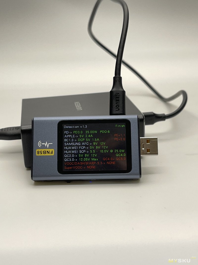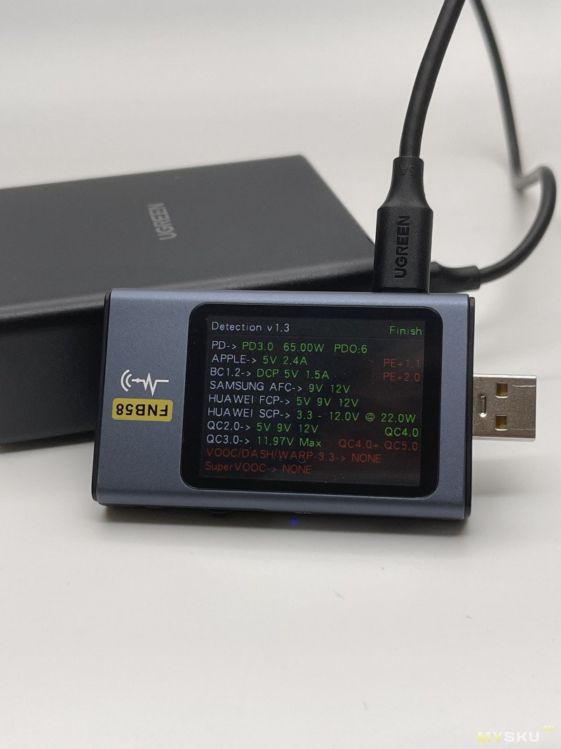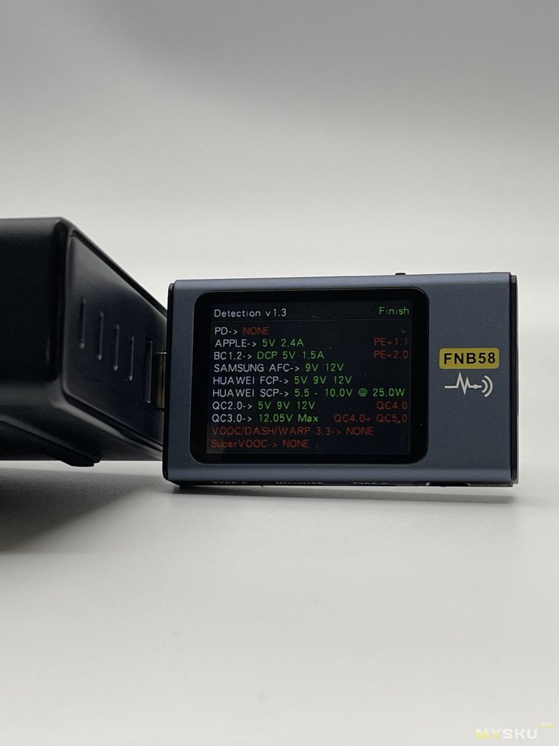 Из-за (или вопреки) применению GaN-технологии нагрев у зарядного устройства контролируемый и легко прогнозируемый. При длительной нагрузке с несколькими устройствами корпус становится теплым, но не горячим. Даже при зарядке ноутбука на высокой мощности перегрева не наблюдается и температура остается в разумных пределах, без запахов и троттлинга. Для компактного 100-ваттного настольного решения это хороший показатель. Если говорить о цифрах, то пирометр засек максимум 50 градусов. Это уже некомфортно, но все еще терпимо.Протоколы зарядки: