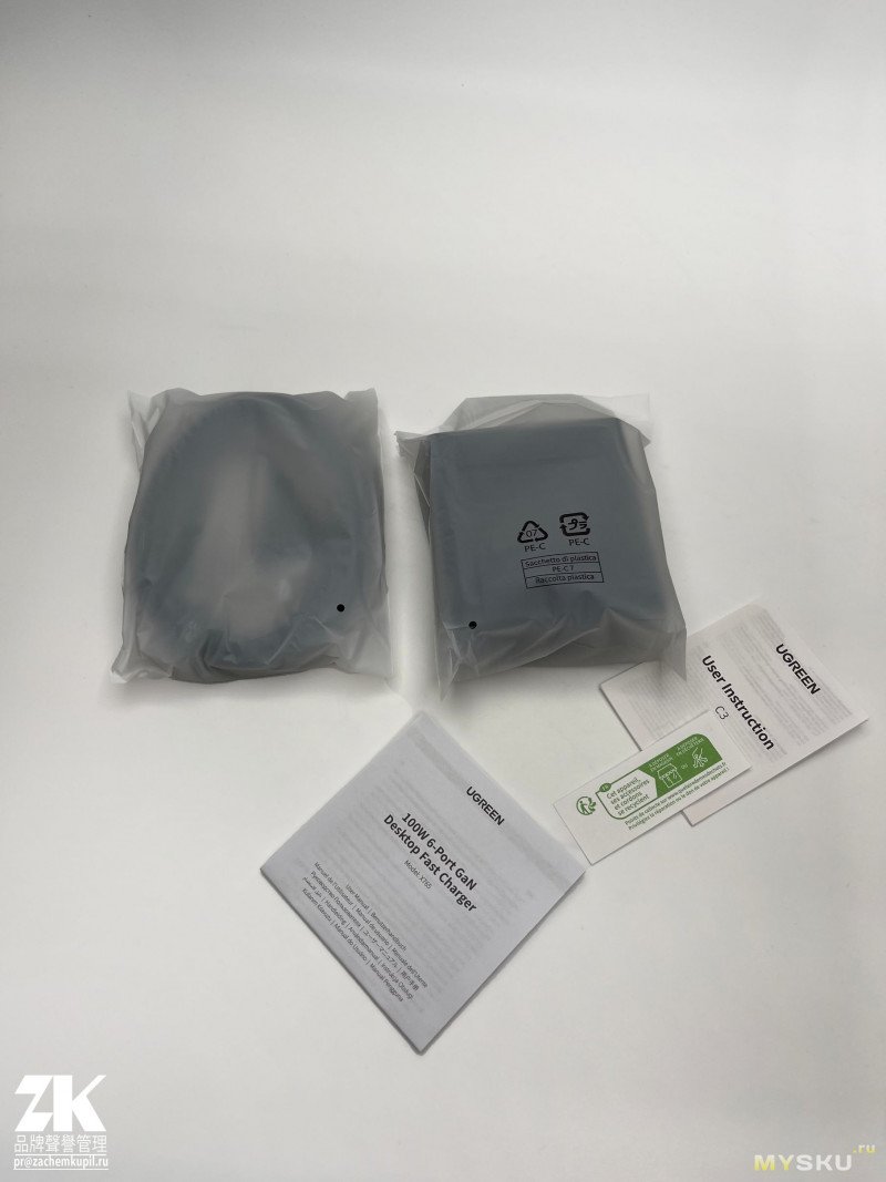 Внутри все запаковано в пакетики. Комплект поставки при этом — максимально простой: сам блок зарядного устройства, кабель питания с евро-вилкой разъема IEC C7, да набор мукулатуры. Дополнительного кабеля USB Type-C не положили. Грустно!