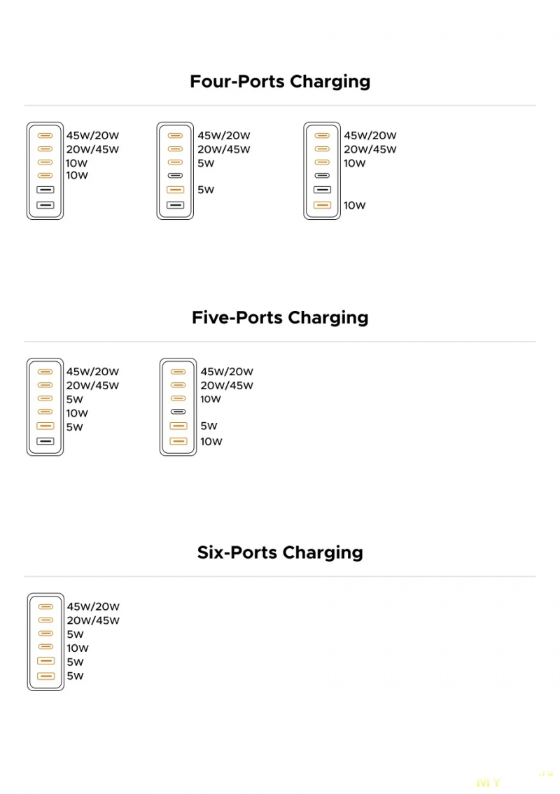 Поскольку у устройства 6 портов и 100 Вт общей совокупной мощности, то режимы работы могут быть максимально затейливыми. Важно отметить: при включении или отключении дополнительного устройства происходит перезагрузка портов.Тесты и примеры использования: