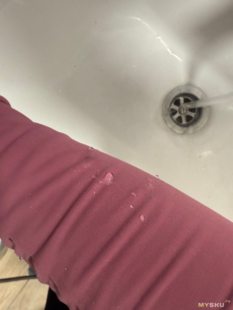 Внешний материал держит немного воду, думаю мелкий дождик будет просто скатываться. Если подержать под струей воды начинает промокать.