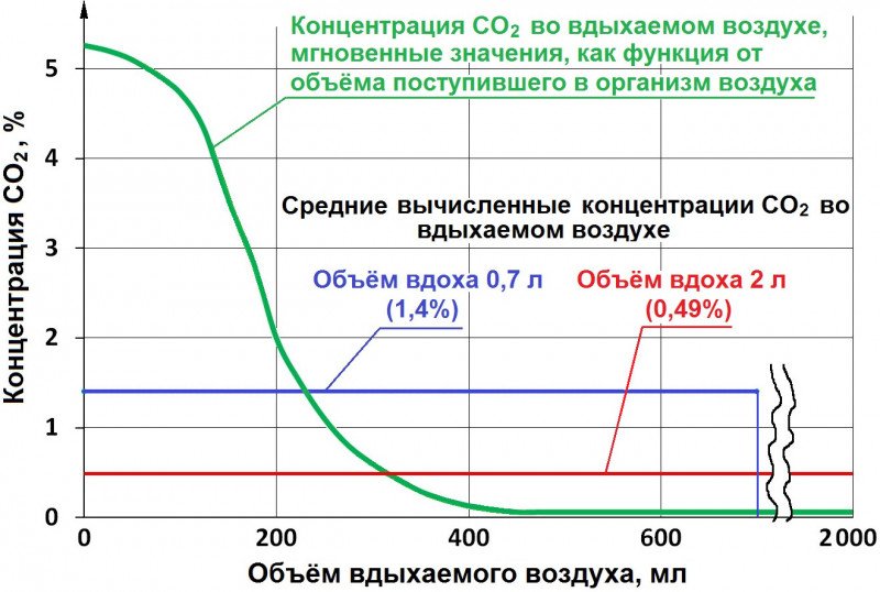 По СО2 вот случайная картинка, чем слабее вдох в респираторе тем выше СО2 во вдыхаемом воздухе, дышать надо глубоко, видно что на малых вдохах 5% это 50 000 ppm, на задержке дыхания больше будет
