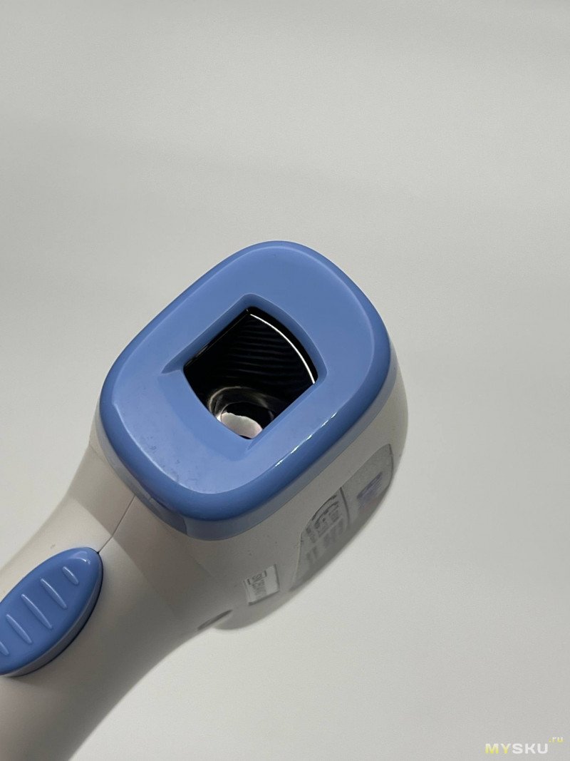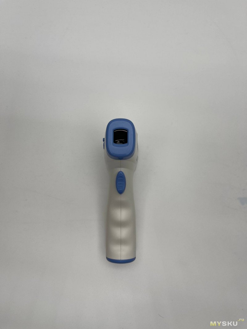 Кнопка включения устройства, она же спусковой крючок расположен с тыльной стороны рукояти. Устройство включается по краткому нажатию и после пару секунд готово к измерению. В случае если нет измерений больше десяти секунд, устройство пикает и выключается. Внутри расположен инфракрасный модуль, считывающий температуру. Никакой дополнительной подсветки или индикации работы со стороны модуля не предусмотрено.