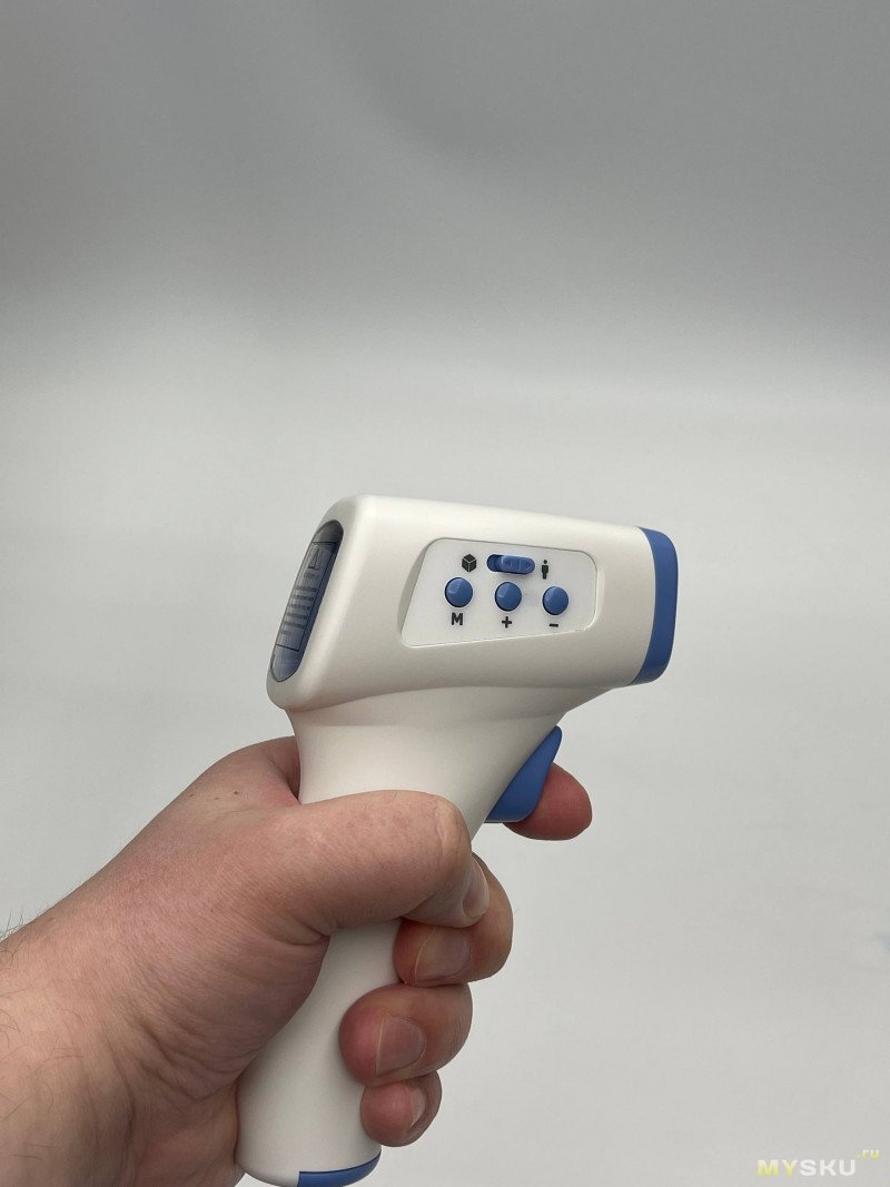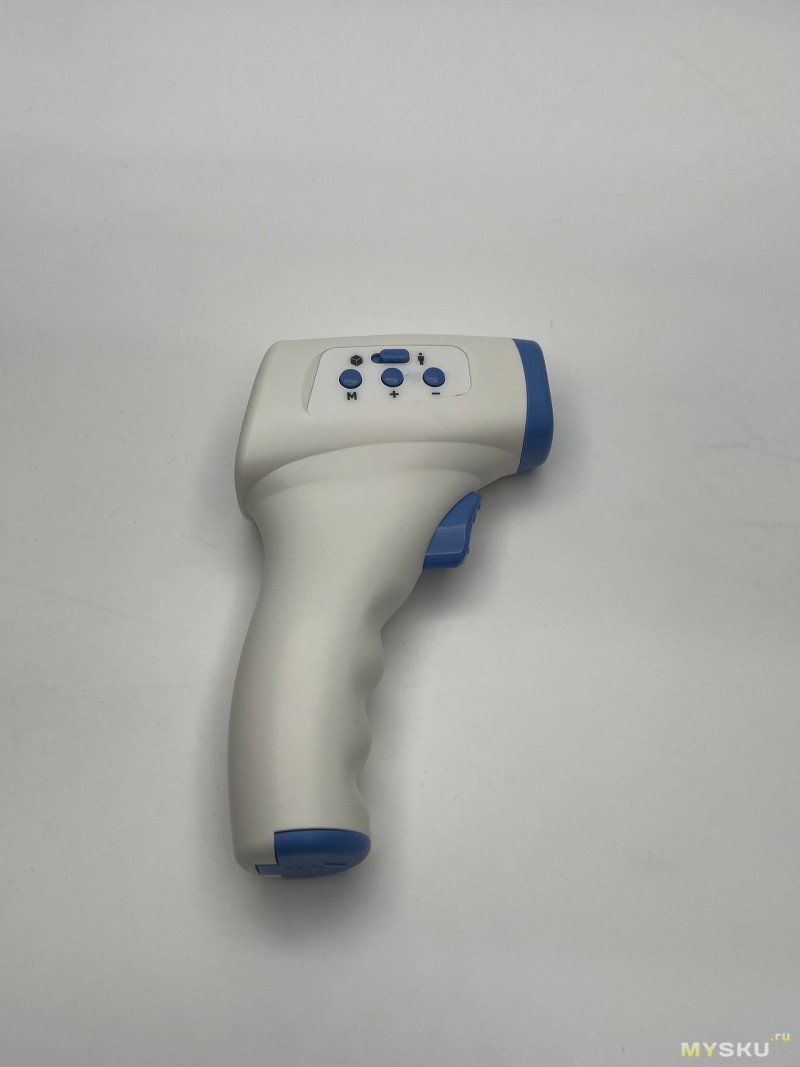 По форме беспроводной термометр представляет собой классический пирометр (это сравнение будет не отпускать вас весь обзор), выполненный в форме пистолета. Хват реализован под некрупную кисть (больше даже женскую). С одной стороны находится кнопки переключения режимов измерения (человек или предмет), кнопки регулировки громкости, а также функциональная кнопка для просмотра истории измерений. А с другой стороны наклейка с описанием модели, бренда и серийным номером.