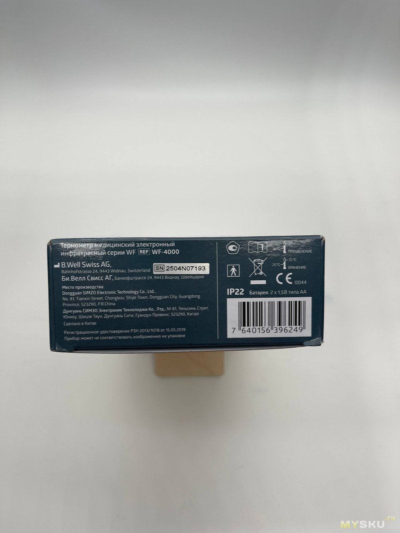 С торца коробки указан серийный номер, штрихкод, а так же много упоминаний Swiss, Switzerland, чтобы рядовой потребитель не в коем случае сомневался, что перед ним чистокровный европеец, а не китайский ОЕМ от Российской фирмы «Альфа-Медика». Но одно дело быть, а другое дело — казаться. Со вторым у термометра все хорошо, а вот первый вариант сильно хромает.