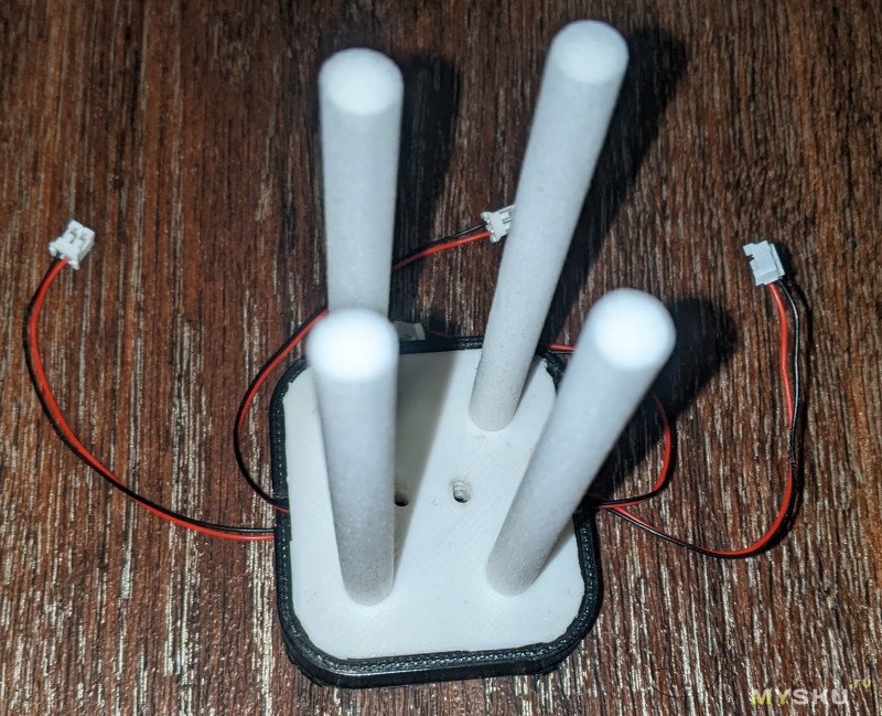 Внутри плата с пьезопластинами увлажнителя и хлопковыми капиллярными трубочками. Трубочки с пластинами никак не стыкуются, для этого нужны держатели. Их в комплекте нет. Однако, есть 3д модель для печати (пример). Я сделал сразу на 4 места. Получается вот такой паучок.