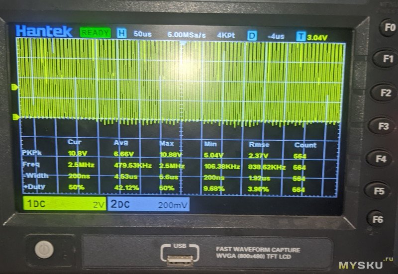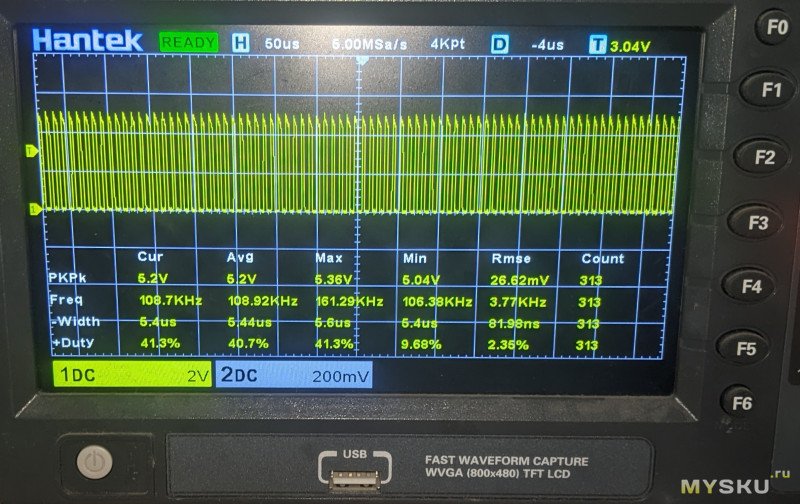 Теперь на осциллографе посмотрим, что происходит на выходных клеммах MCU. Частота нехилая, около 108 кГц, как и заявлено.