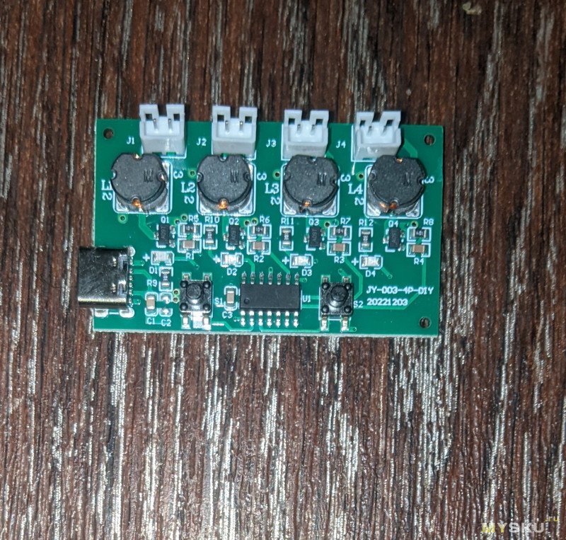 Плата имеет 4 драйвера пьезопластин, 4 светодиода, безымянный контроллер, 2 кнопки и разъем TYPE-C. Судя по всему, безымянная MCU — какой-то очередной шедевр китайской промышленности, подобно тем, что ставят в ШИМ-регуляторы и прочие поделия...