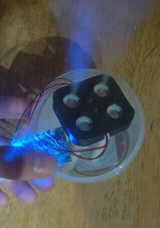Вторая кнопка управляет режимами. Всего режимов 5. Первый самый интересный — увлажнитель начинает поочередно переключать форсунки. Выглядит как мигающая гирлянда.