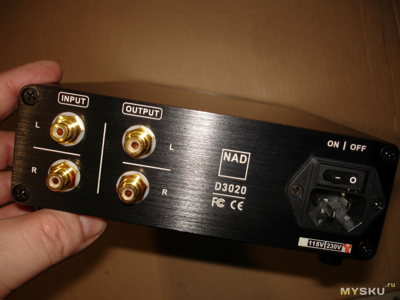 Панель сзади побогаче. Есть RCA входы и выходы слева, и гнездо под силовой кабель с выключателем справа. По центру красуется (нескромно и незаконно) фирменный логотип NAD и номер модели D3020: