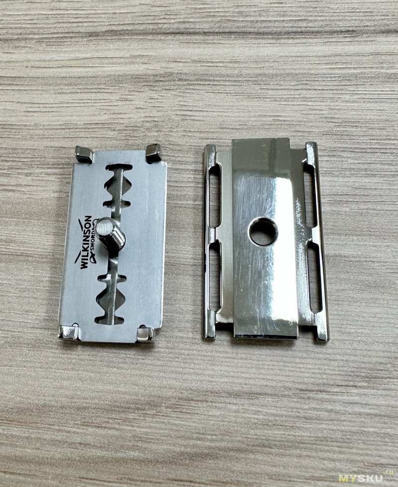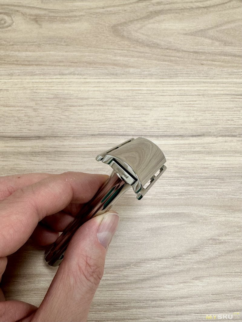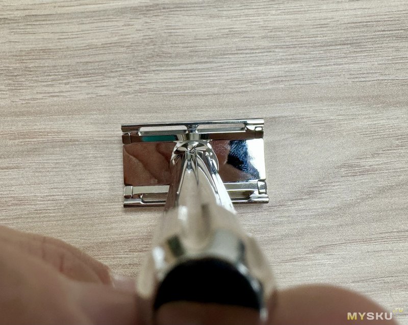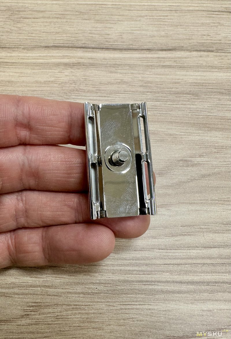 На внутренней поверхности верхней плиты присутствуют следы от фрезы, а нижняя плита также отполирована в зеркало и с внутренней стороны (хотя в моём экземпляре присутствует лёгкая потертость — небольшой дефект полировки).Что касается установки лезвия, то оно легко ложится в верхнюю крышку, где дополнительно фиксируется вертикальными частями верхней плиты с краёв. Лезвие устанавливается и снимается без каких либо вопросов и не цепляется за резьбу верхней плиты.