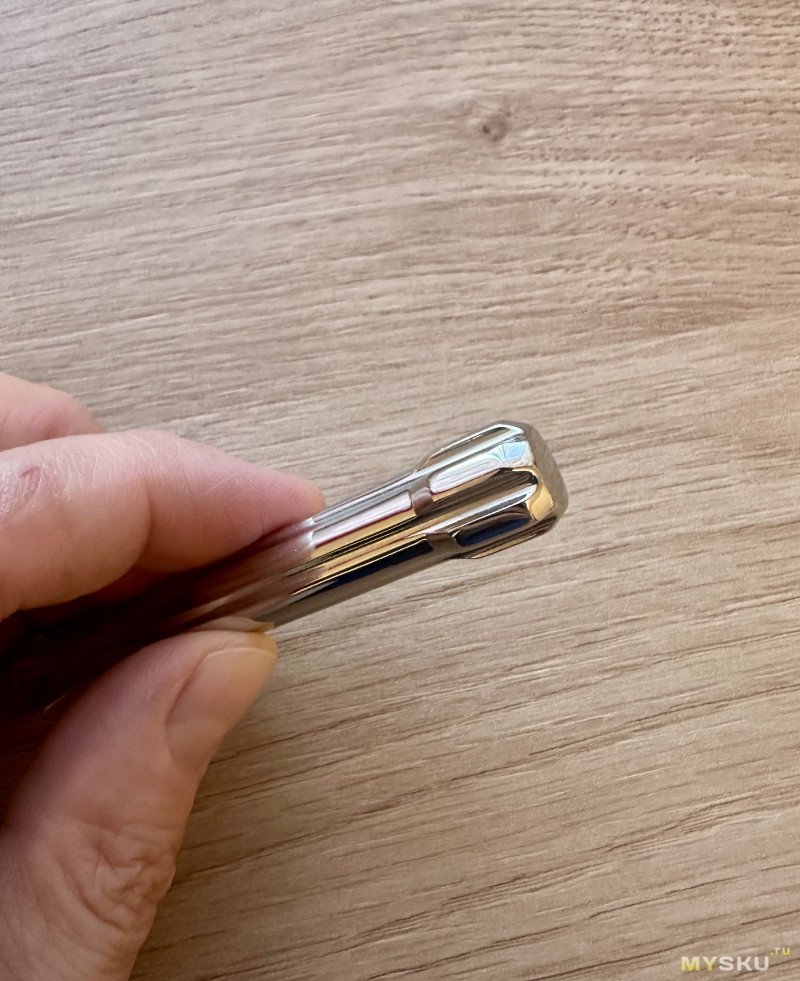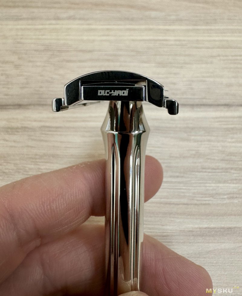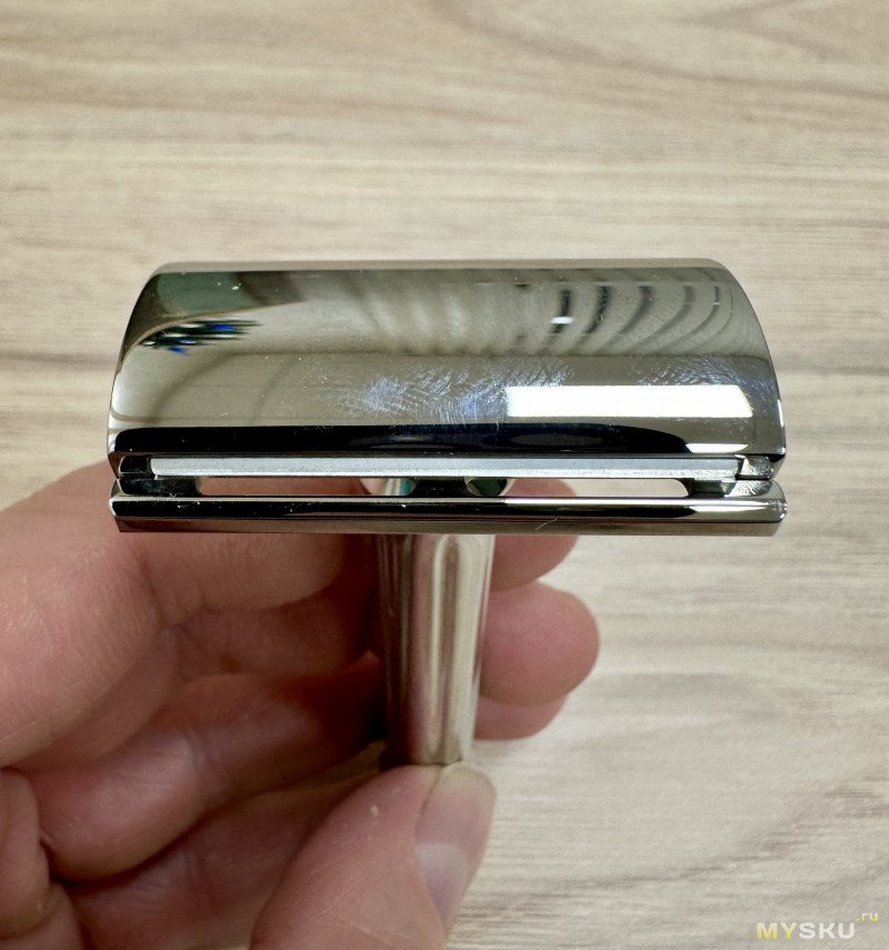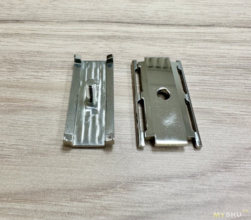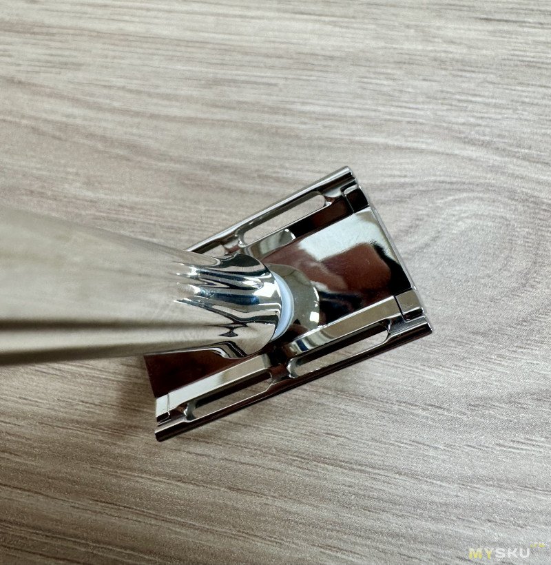 На внутренней поверхности верхней плиты присутствуют следы от фрезы, а нижняя плита также отполирована в зеркало и с внутренней стороны (хотя в моём экземпляре присутствует лёгкая потертость — небольшой дефект полировки).Что касается установки лезвия, то оно легко ложится в верхнюю крышку, где дополнительно фиксируется вертикальными частями верхней плиты с краёв. Лезвие устанавливается и снимается без каких либо вопросов и не цепляется за резьбу верхней плиты.