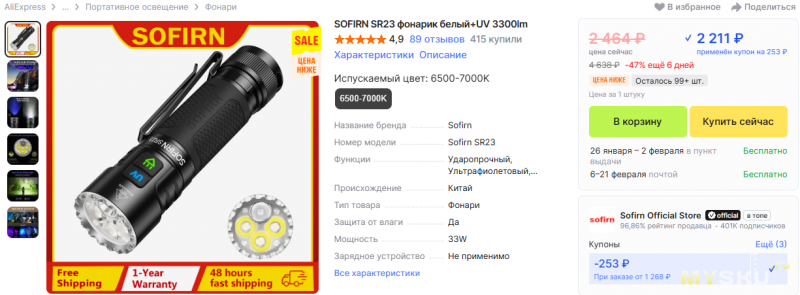 Светодиодный фонарь SOFIRN SR23 показывает хороший уровень реализации, но не самое востребованное сочетание основного и дополнительного света. Яркий УФ нужен далеко не всем, но если часто нужен, то тут он довольно мощный (зона действия 1,5 м где-то) + хороший заливной белый свет (без пульсаций). Выделю относительную компактность и магнит в хвосте, простое управление двумя кнопками: плавная регулировка яркости, память режимов, быстрые доступы к турбо/мунлайту (2 клика), ёмкий аккумулятор 21700 (5000 мАч). Из минусов: не хватает зарядки внешних устройств, быстрый сброс яркости с турбо.Брать можно, цена не сильно кусачая (с учетом честного 21700 в комплекте). Но у меня на одном экземпляре такого фонаря был глюк — подсветка кнопок (индикатор заряда) перестала выключаться. Фонарь поменяли по гарантии.