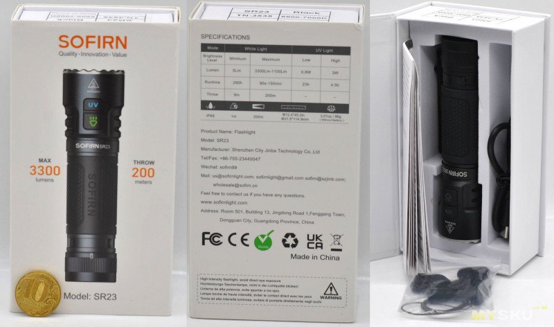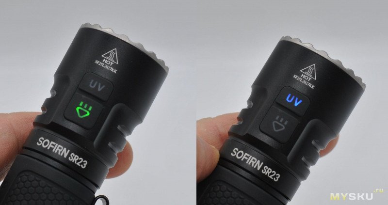 Под стеклом три TN3535 (пара таких в Sofirn ST10) с отдельными отражателями и УФ Luminus SST08 со стеклом Вуда. Еще сочетание 3хTN3535 у бренда в налобнике HS43.Управление реализовано парой кнопок (каждая за свой тип света), есть встроенная зарядка (порт Type-C защищен плотной заглушкой), в хвосте магнит и проушина под темляк.