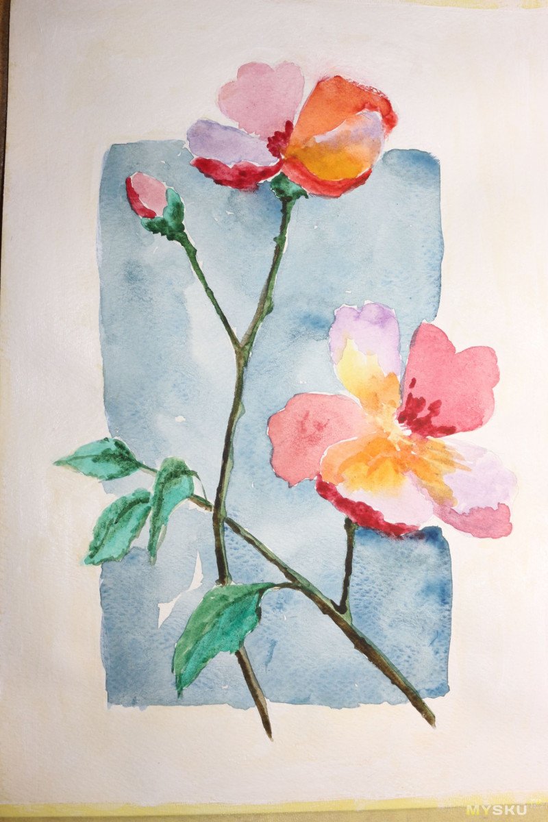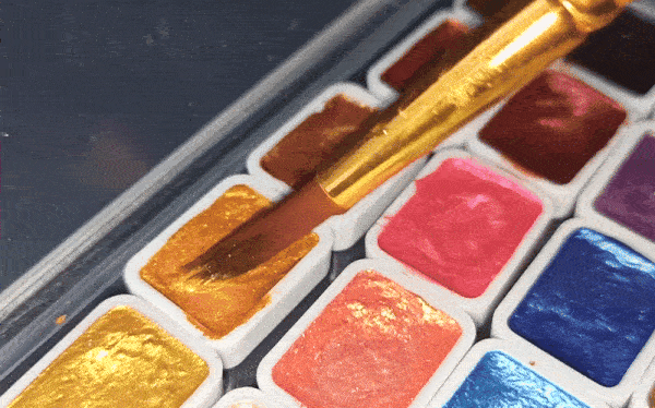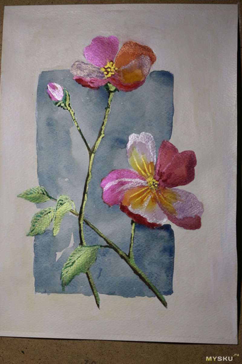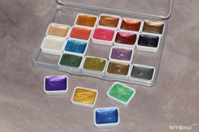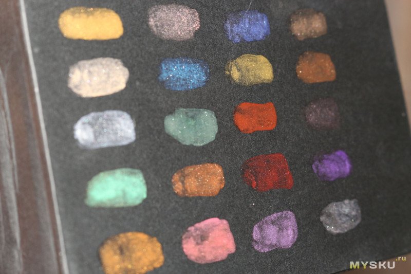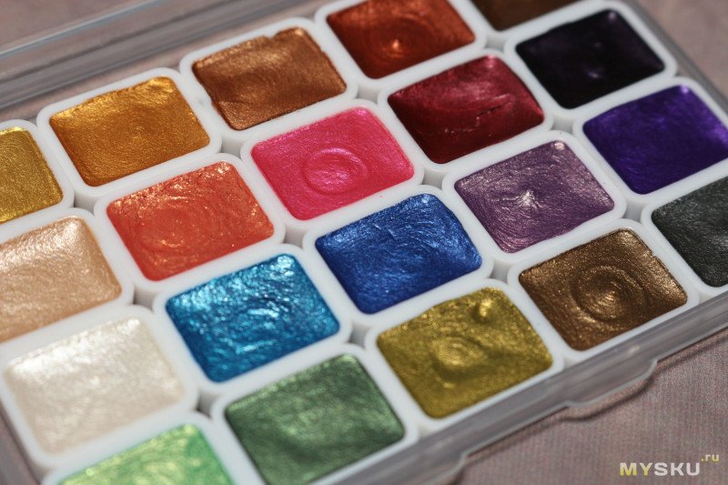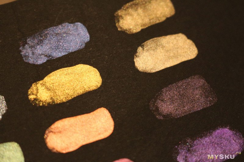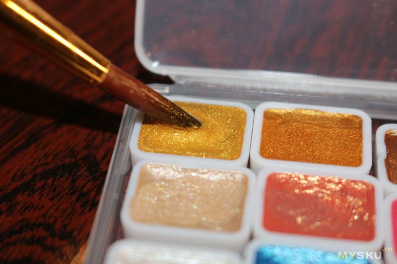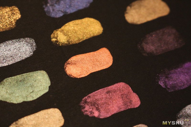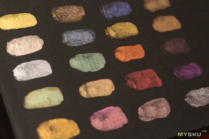 Визуально эти краски отличаются от обычной акварели. Даже пока они сухие, виден их перламутровый блеск.
