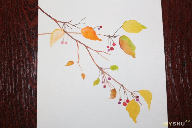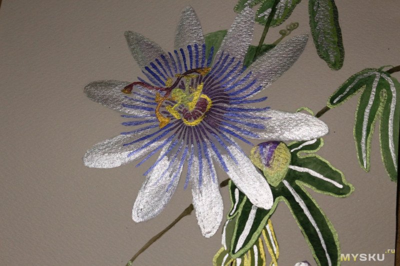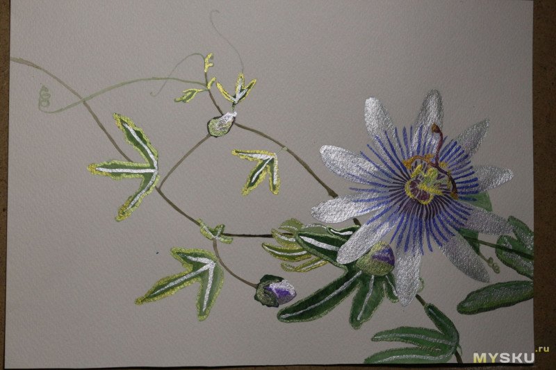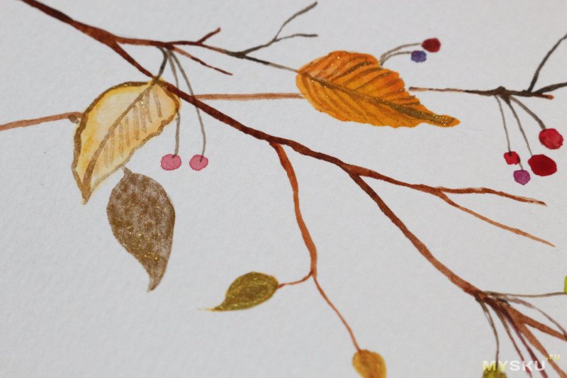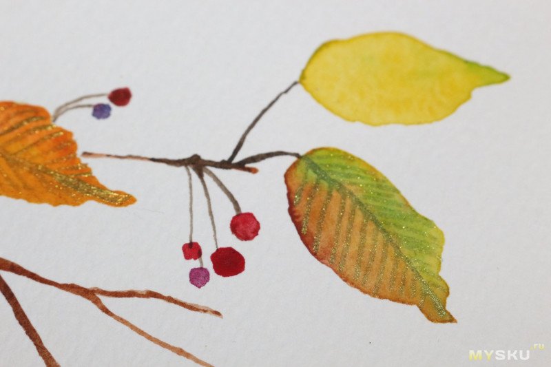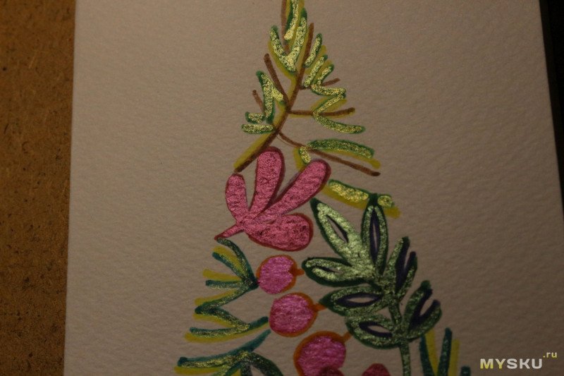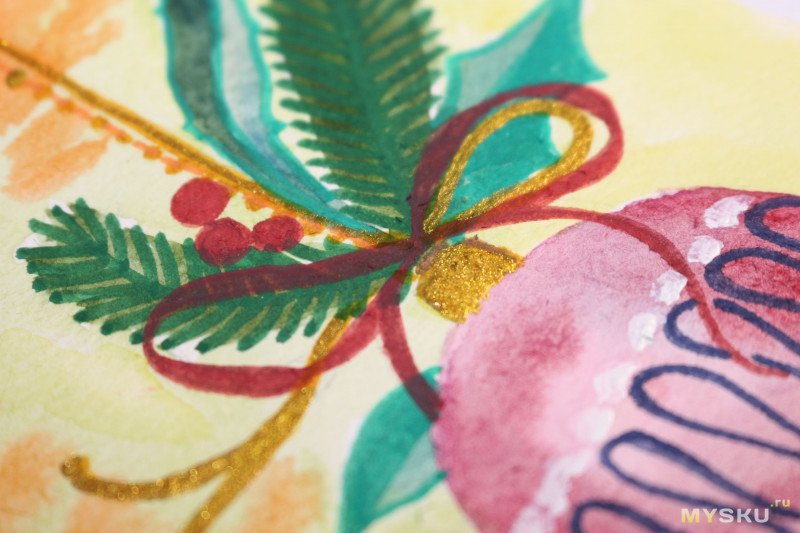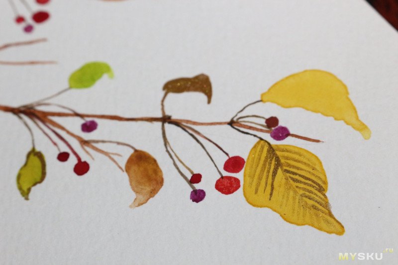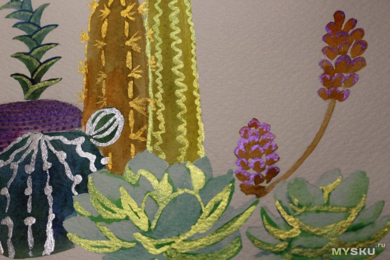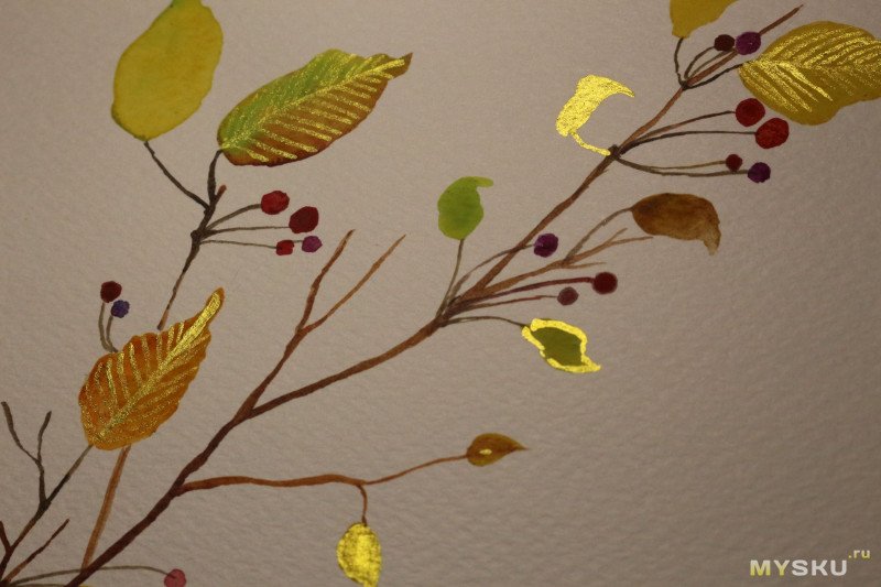 Здесь видно разную плотность красок. Если металлик нанести без акварельного слоя, бумага будет просвечивать.