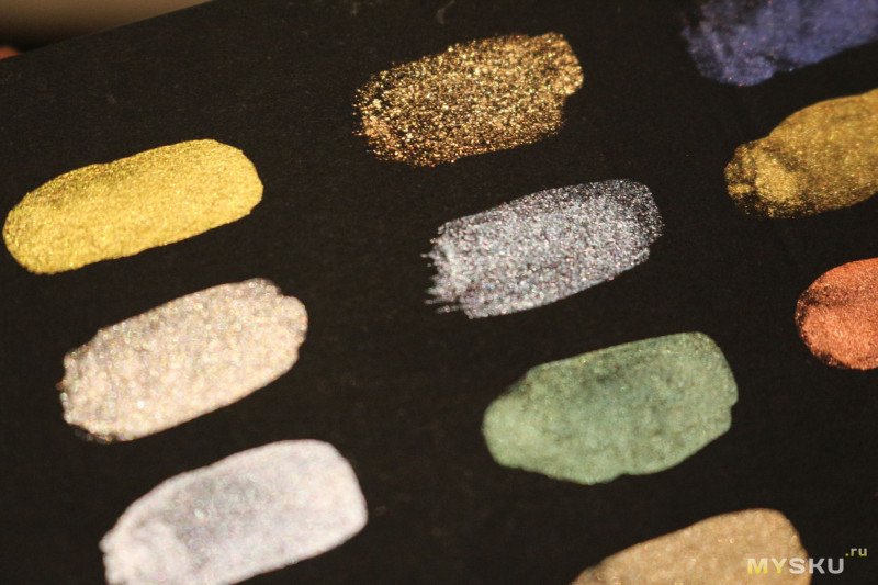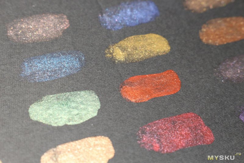 Делаю тест на черной бумаге. Краска ложится в меру плотно. Цвета яркие, с металлическим отливом, который лучше виден под углом к свету.