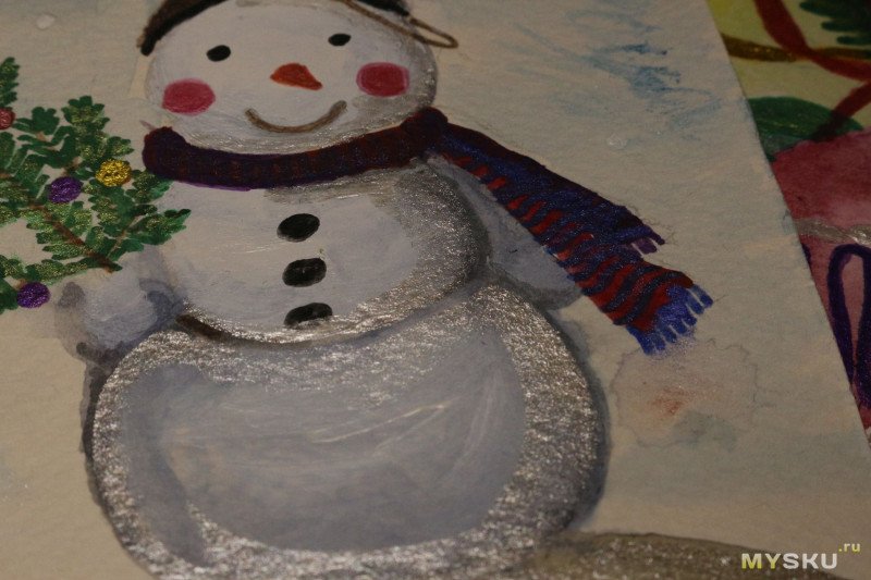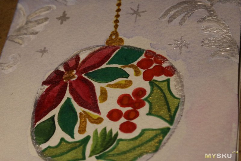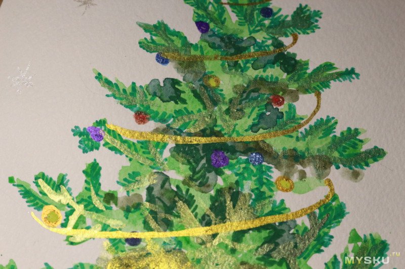 Прорисовываю детали красками металлик. Рисовать нужно по сухому слою, иначе металлик некрасиво растекается. Металлическую акварель можно смешивать для достижения новых оттенокв.