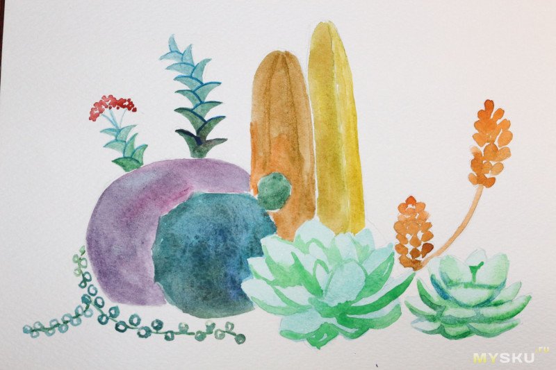 Так выглядит палитра после использования — расход этих красок чуть больше чем у обычной акварели.