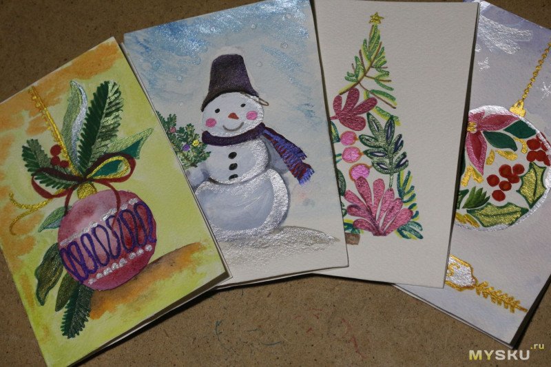Для начала решила сделать яркие акценты на новогодних открытках из обзора акриловых маркеров.