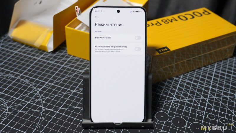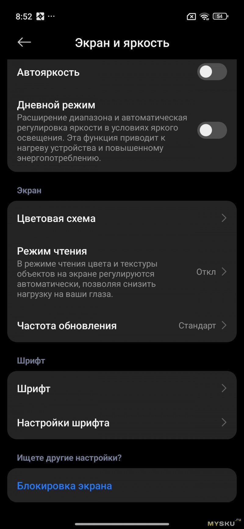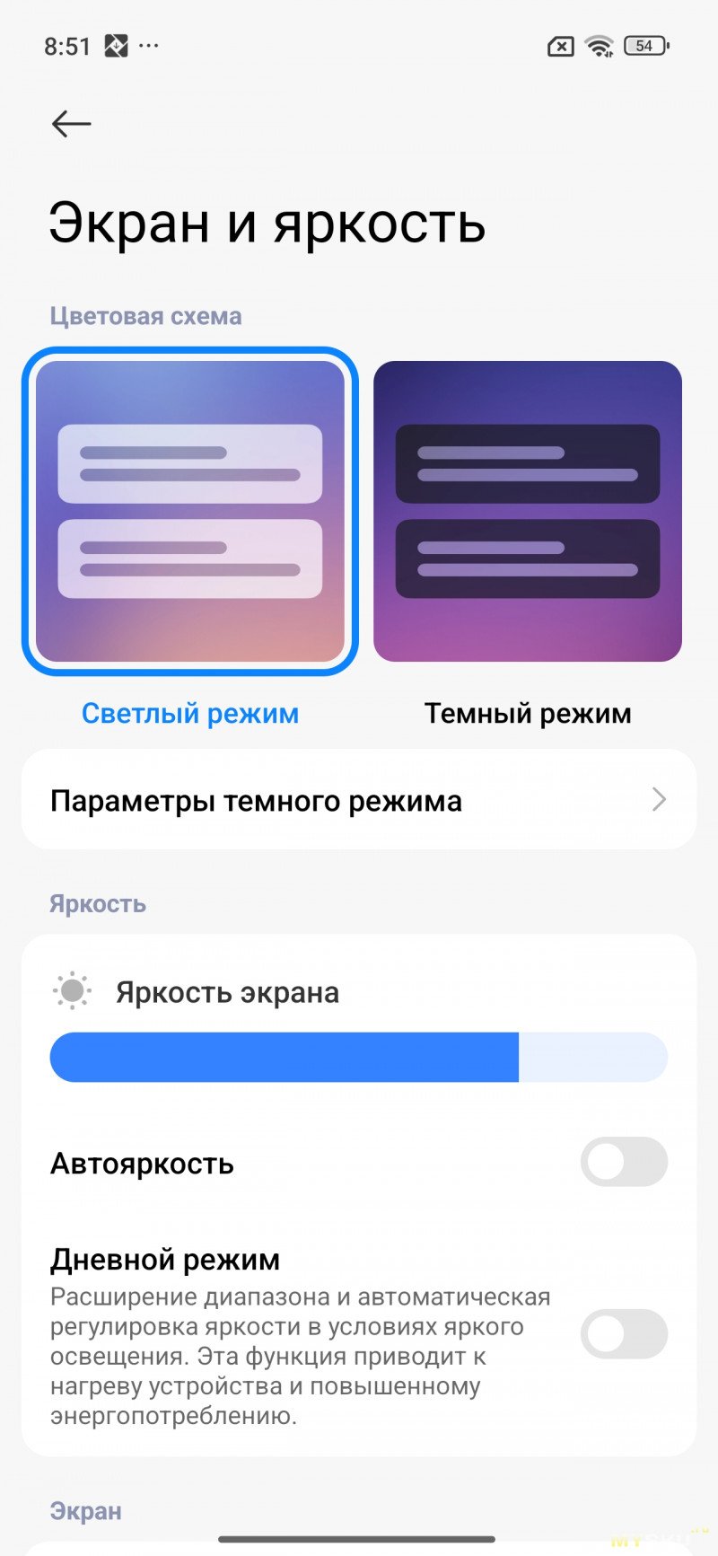 В параметрах дисплея можно выбрать частоту обновления дисплея (120Гц или 60Гц), тему (тёмную и светлую), включить «режим чтения».