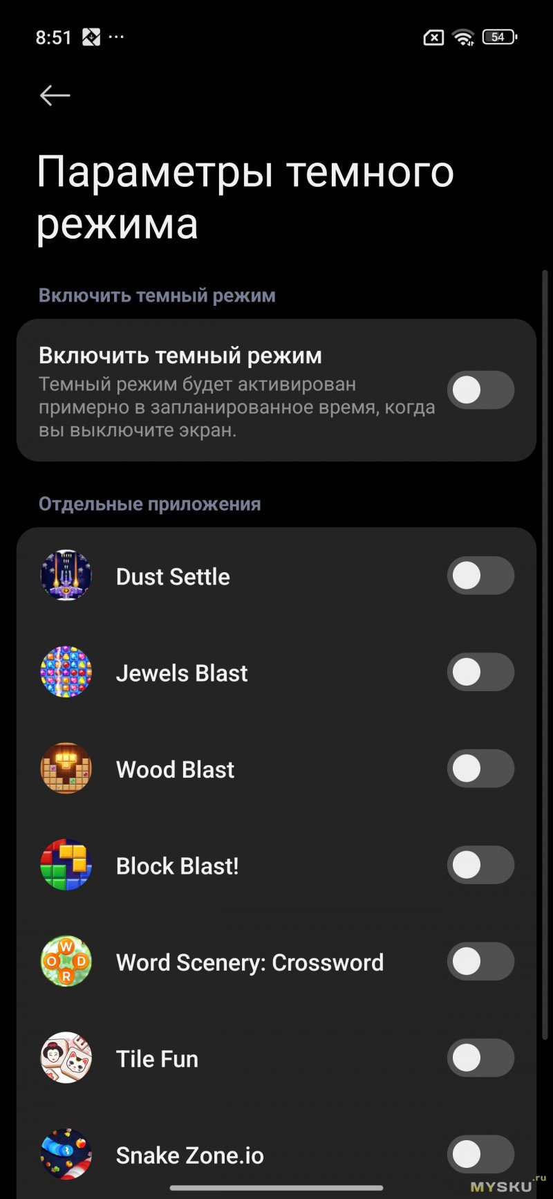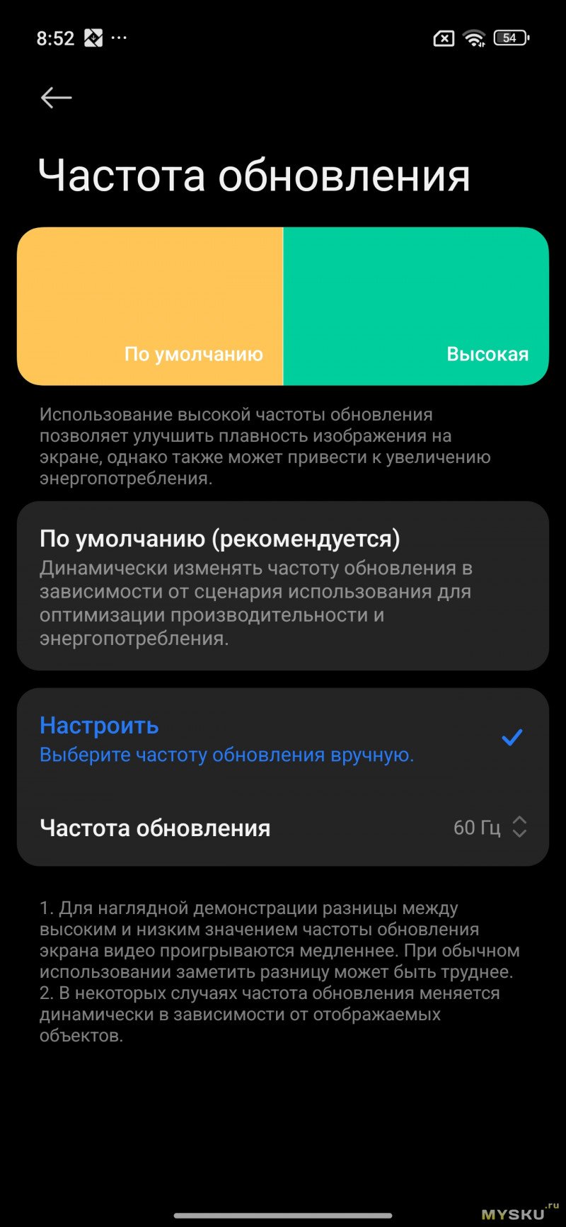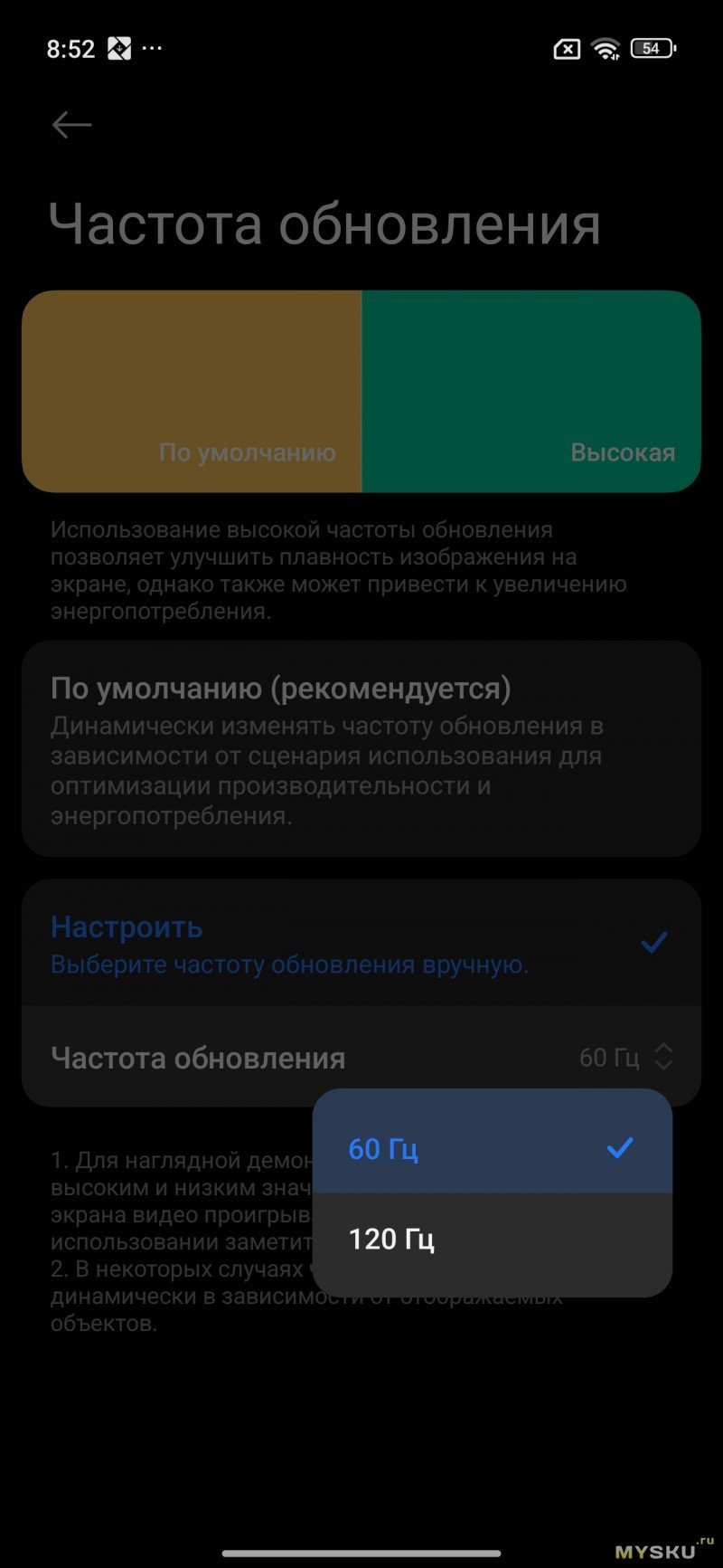 В параметрах дисплея можно выбрать частоту обновления дисплея (120Гц или 60Гц), тему (тёмную и светлую), включить «режим чтения».