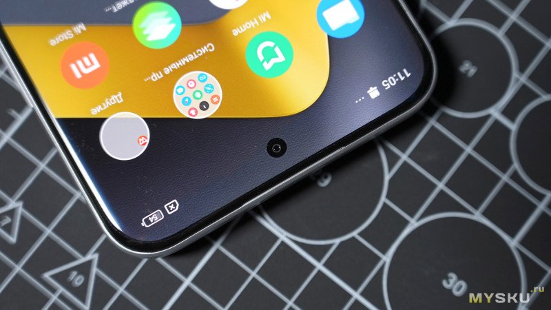 Наверху дисплея посередине находится фронтальная камера для сэлфи, записи кружков и прочих себяснимательных сценариев. Камера основана на сенсоре 32-мегапиксельном сенсоре OmniVision OV32D с диафрагмой f/2.2. Фокусировка фиксированная. За защиту дисплея от внешних механических воздействий отвечает стекло Corning Gorilla Glass Victus 2. Сверху, как уже говорил, стекло покрыто также заводской плёнкой. Края экрана закруглённые.