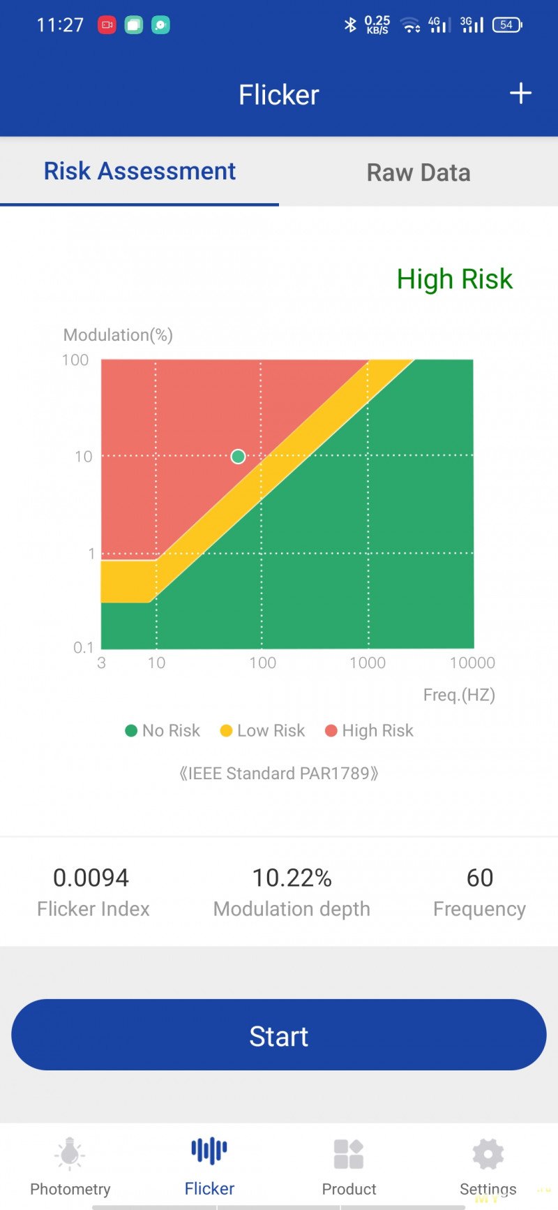 В меню настроек частота обновления настраивается между 120Hz и 60Hz. Для регулировки яркости используется ШИМ-технология с частотой 3840Гц, о чём производитель заранее сообщает. Проверим подсветку на трёх уровнях — 100%, 50% и 0% яркости. Яркость на уровнях между 50% и 100% можно считать приемлемой при долгом использовании. На минимальной яркости и до 50% коэффициент мерцания превышает разрешённые по санитарным нормам 5%, поэтому если глаза индивидуально чувствительные, то будут утомляться.