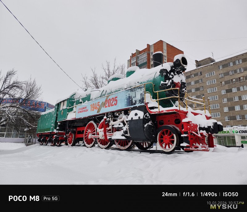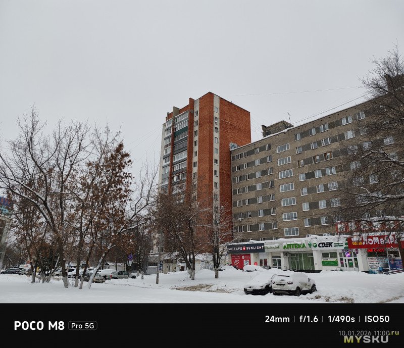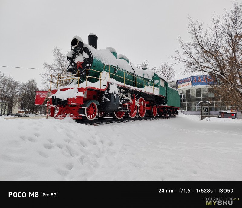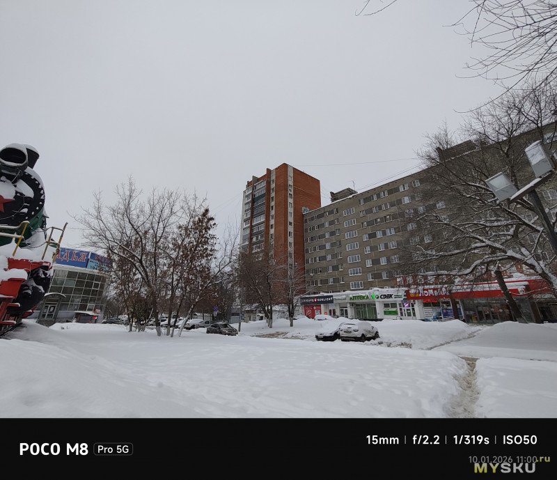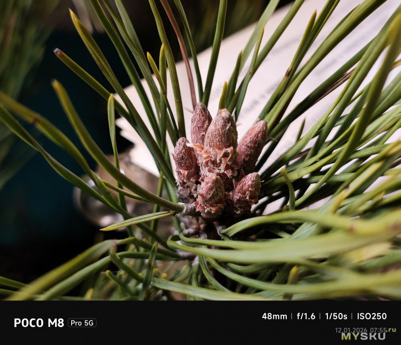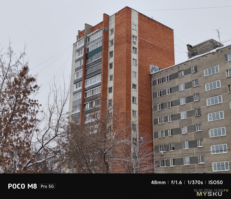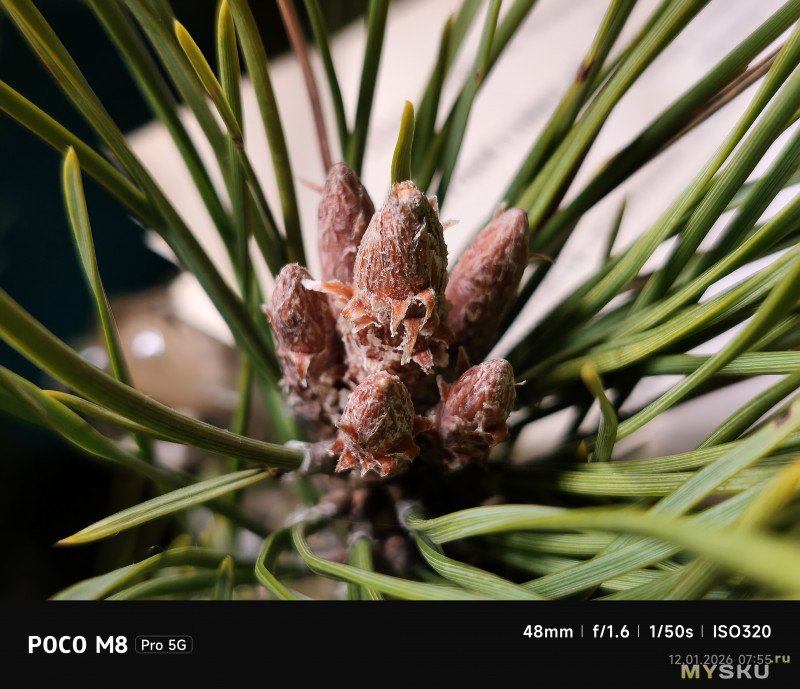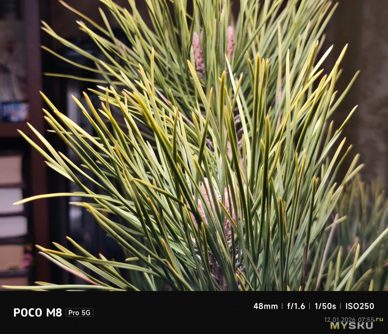 Камеры на тыльной стороне устройства две — основная (OmniVision OV50E, 50Мп, 24мм, F1.6) и широкоугольная (OmniVision OV08F, 8Мп, 15мм, F2.2) — не так много по современным меркам. Отдельной макрокамеры нет, впрочем, по опыту она не особо нужна, так как с задачей съёмки на МДФ хорошо справляется и основная камера. Широкоугольная камера не поддерживает автофокус. Телевики же обычно являются прерогативой флагманских моделей смартфонов, но снимая на Poco M8 Pro через основную камеру доступно двухкратное цифровое увеличение, а на снимках впечатывается соответствующая подпись с фокусным расстоянием 48мм. Видеосъёмка не предлагает выдающихся режимов записи, здесь всё обычно — 1080@60 либо 4К@30. Есть оптическая стабилизация картинки, которая хорошо сглаживает дрожания рук. Замедленная съёмка позволяет записывать видео либо в 1080@120, либо в 720@240. Кодеки для записи видео выбираются — H264 или H265. Фотокамера поддерживает съёмку в RAW.