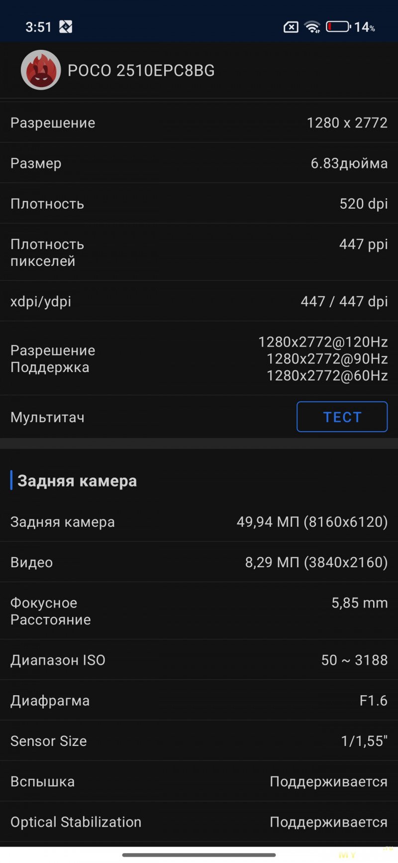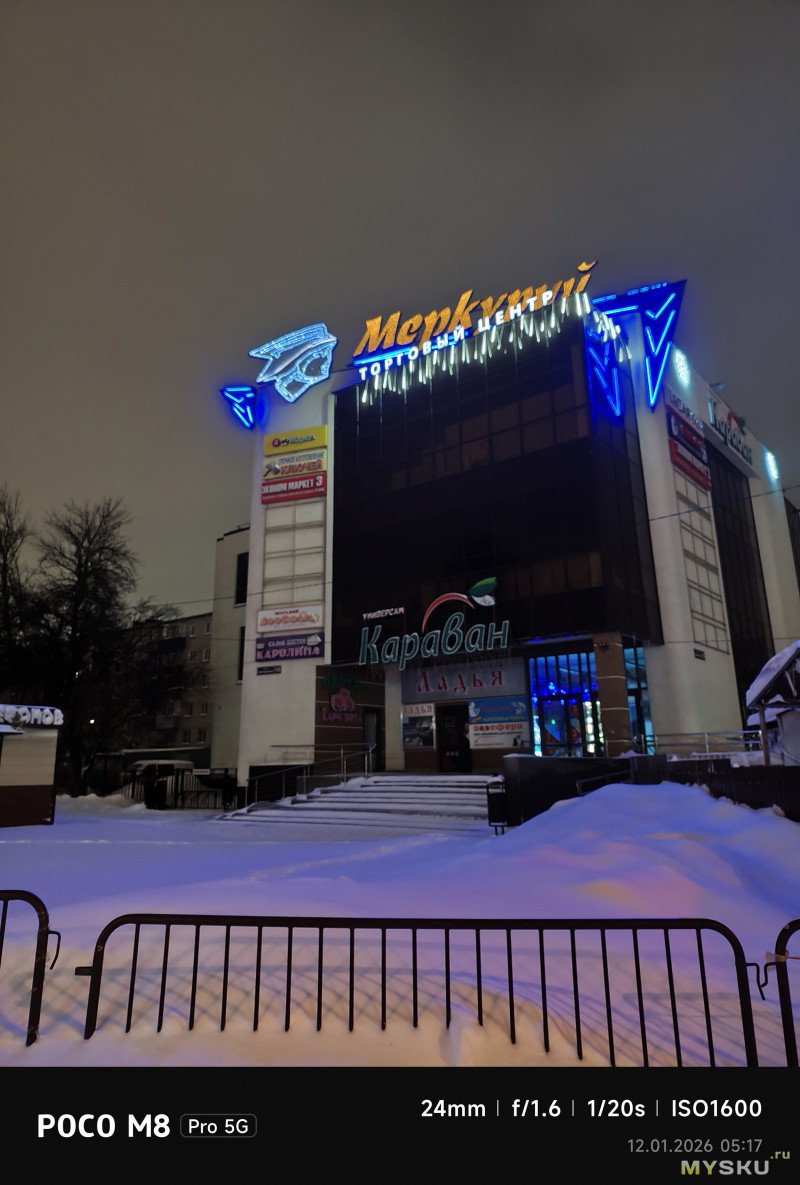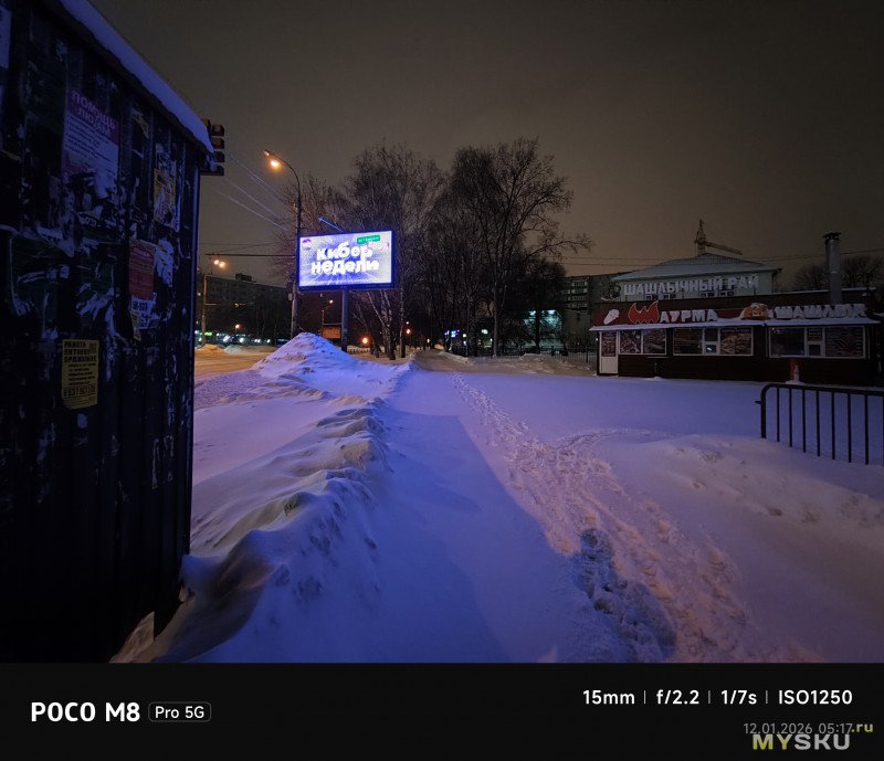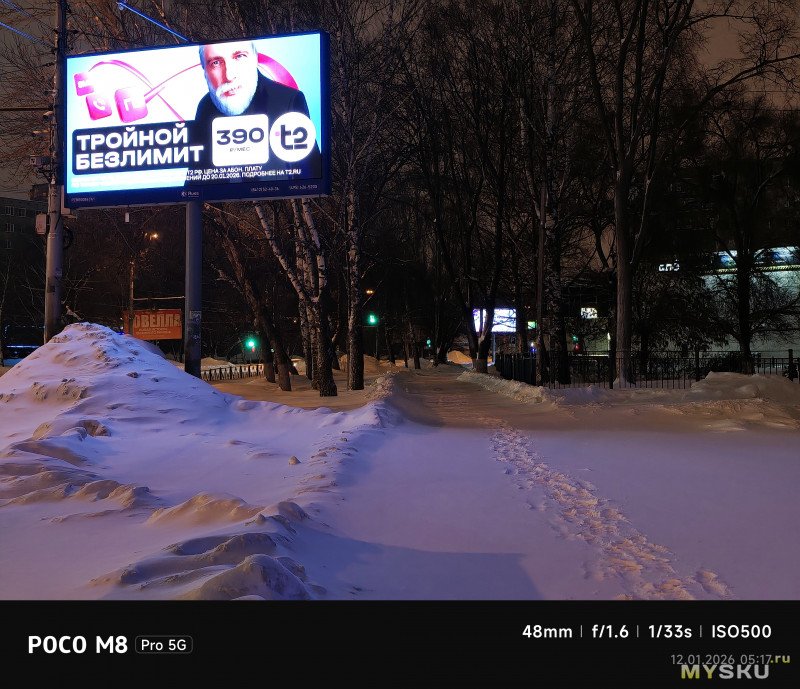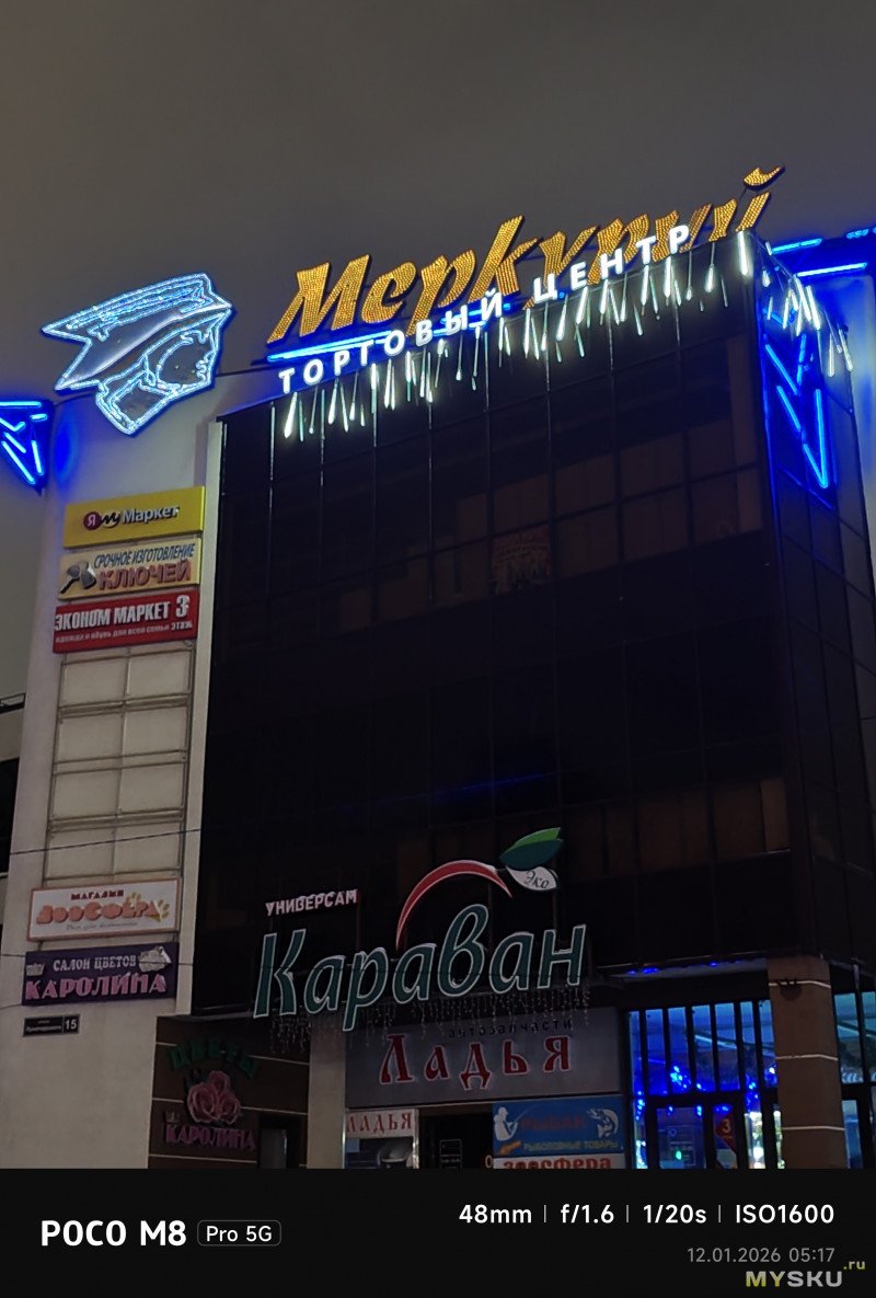 Камеры на тыльной стороне устройства две — основная (OmniVision OV50E, 50Мп, 24мм, F1.6) и широкоугольная (OmniVision OV08F, 8Мп, 15мм, F2.2) — не так много по современным меркам. Отдельной макрокамеры нет, впрочем, по опыту она не особо нужна, так как с задачей съёмки на МДФ хорошо справляется и основная камера. Широкоугольная камера не поддерживает автофокус. Телевики же обычно являются прерогативой флагманских моделей смартфонов, но снимая на Poco M8 Pro через основную камеру доступно двухкратное цифровое увеличение, а на снимках впечатывается соответствующая подпись с фокусным расстоянием 48мм. Видеосъёмка не предлагает выдающихся режимов записи, здесь всё обычно — 1080@60 либо 4К@30. Есть оптическая стабилизация картинки, которая хорошо сглаживает дрожания рук. Замедленная съёмка позволяет записывать видео либо в 1080@120, либо в 720@240. Кодеки для записи видео выбираются — H264 или H265. Фотокамера поддерживает съёмку в RAW.